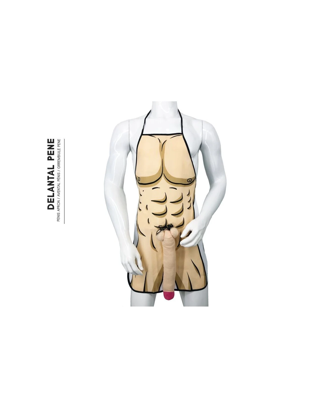 Delantal con diseño impreso de torso masculino musculoso y pene 3D colgante en tela suave con detalles de vello sintético. Ideal para despedidas de soltero/a, fiestas de adultos, cumpleaños con bromas o cualquier ocasión que necesite una dosis extra de risa y picardía. El delantal cubre completamente el torso y se ajusta fácilmente con cintas al cuello y cintura.