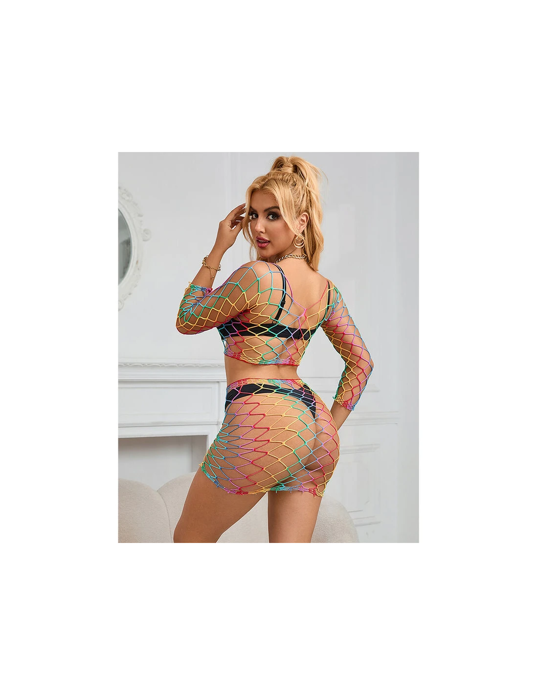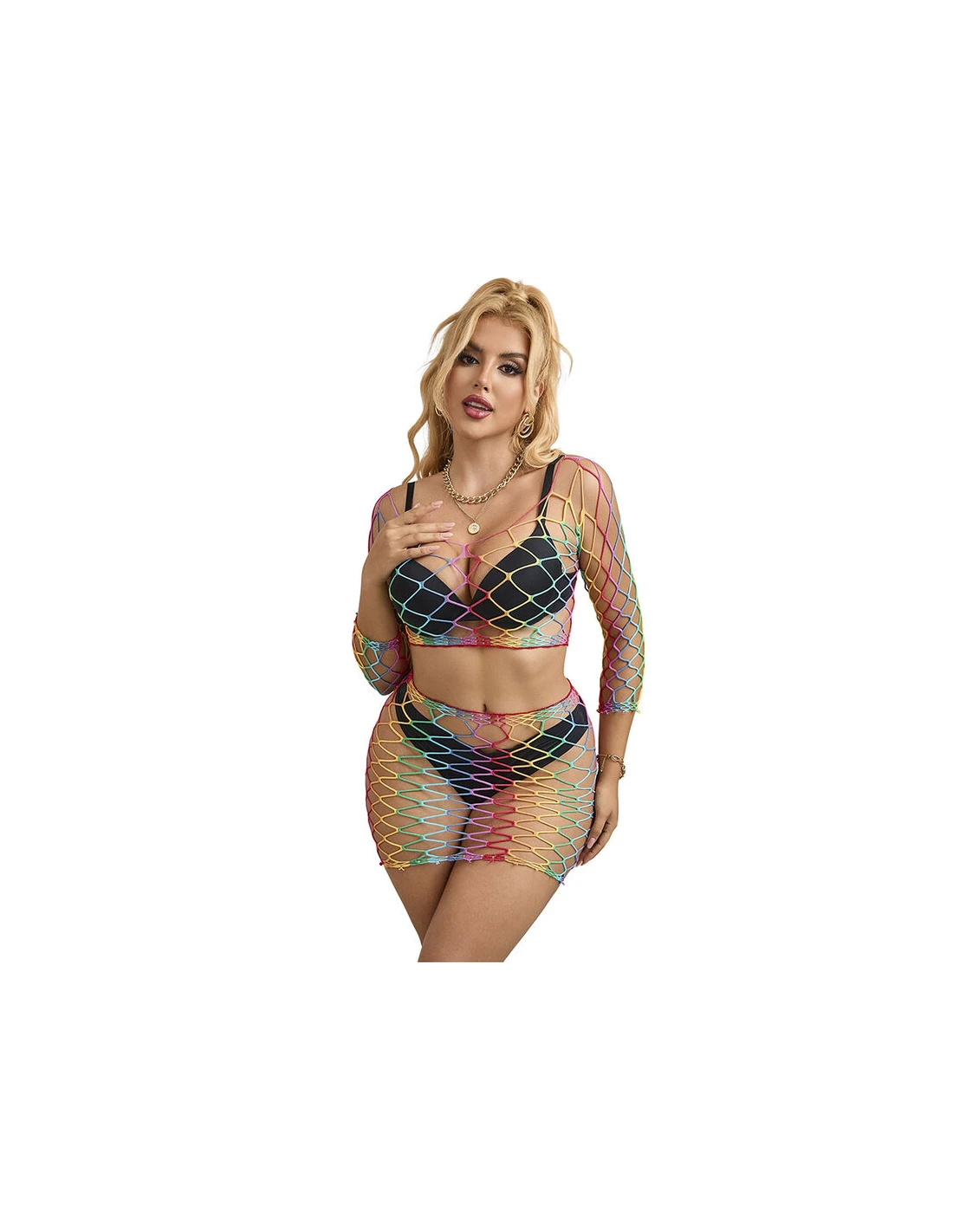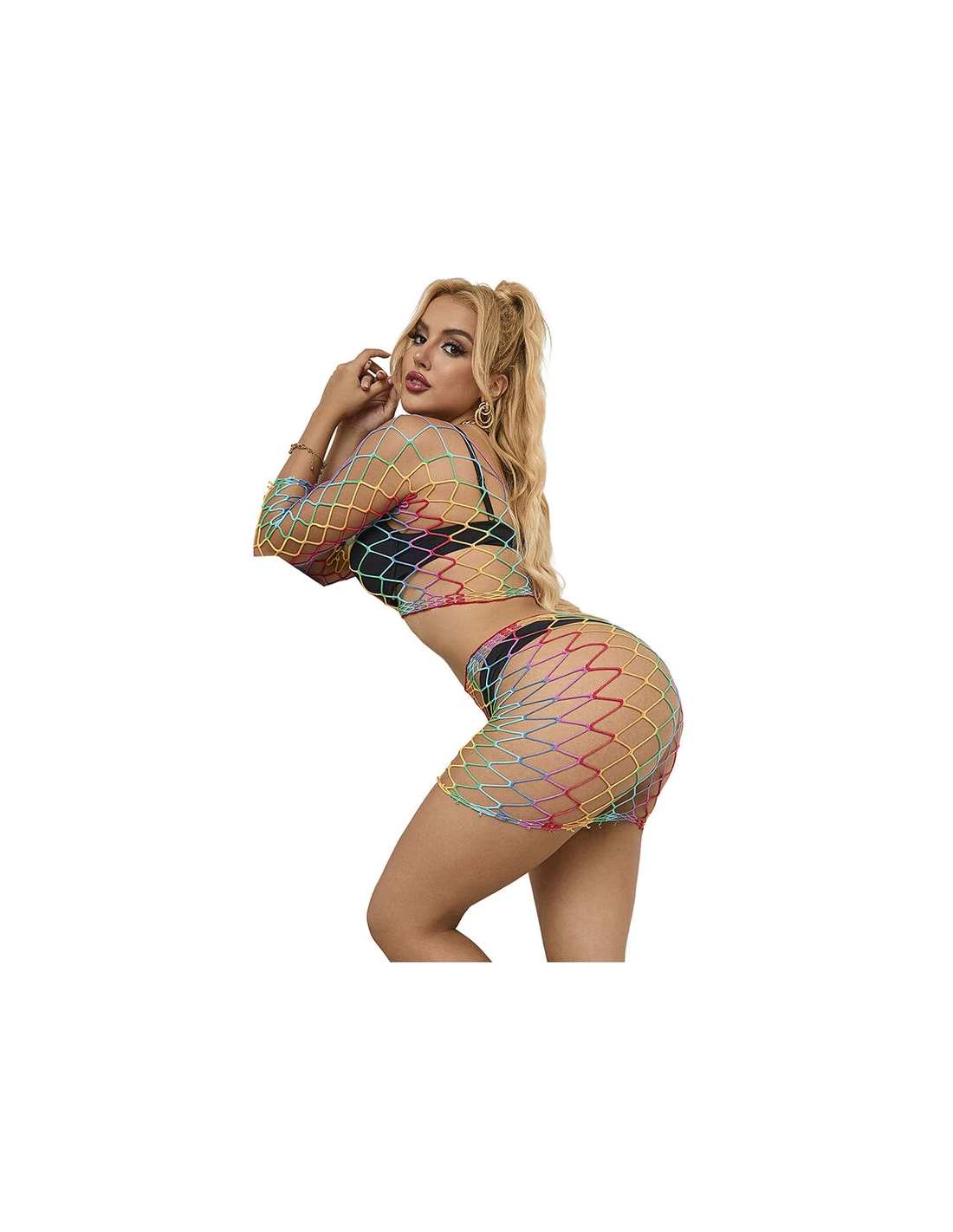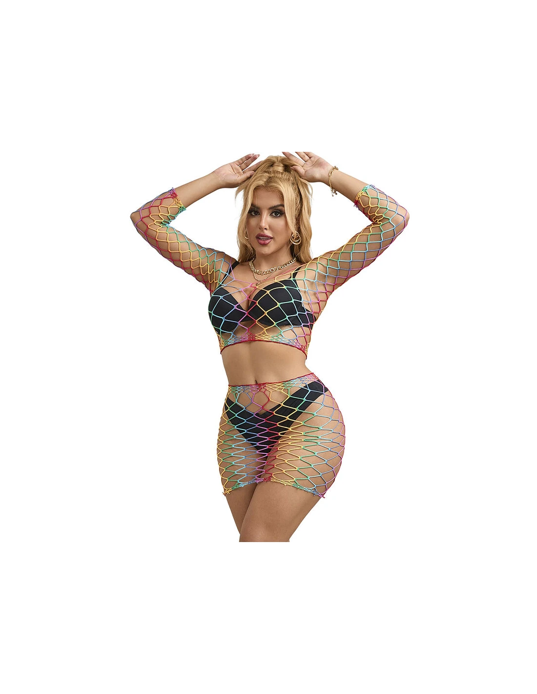 Este body de rejilla en dos piezas con colores arcoíris es una prenda que equilibra perfectamente estilo, comodidad y versatilidad.
