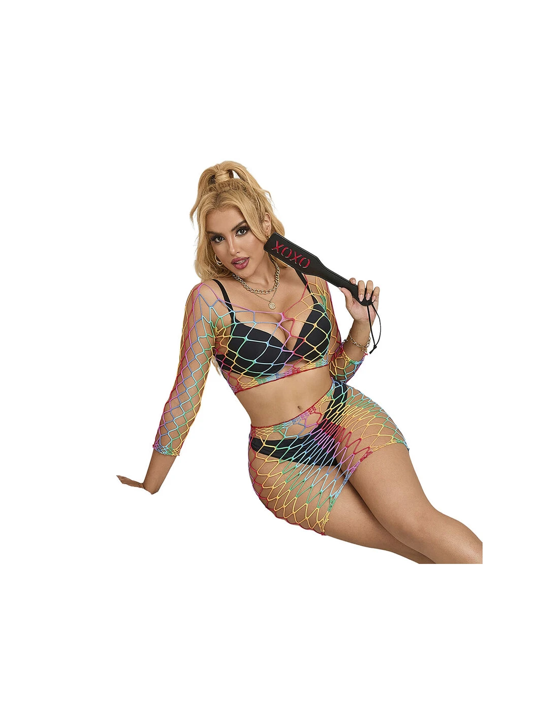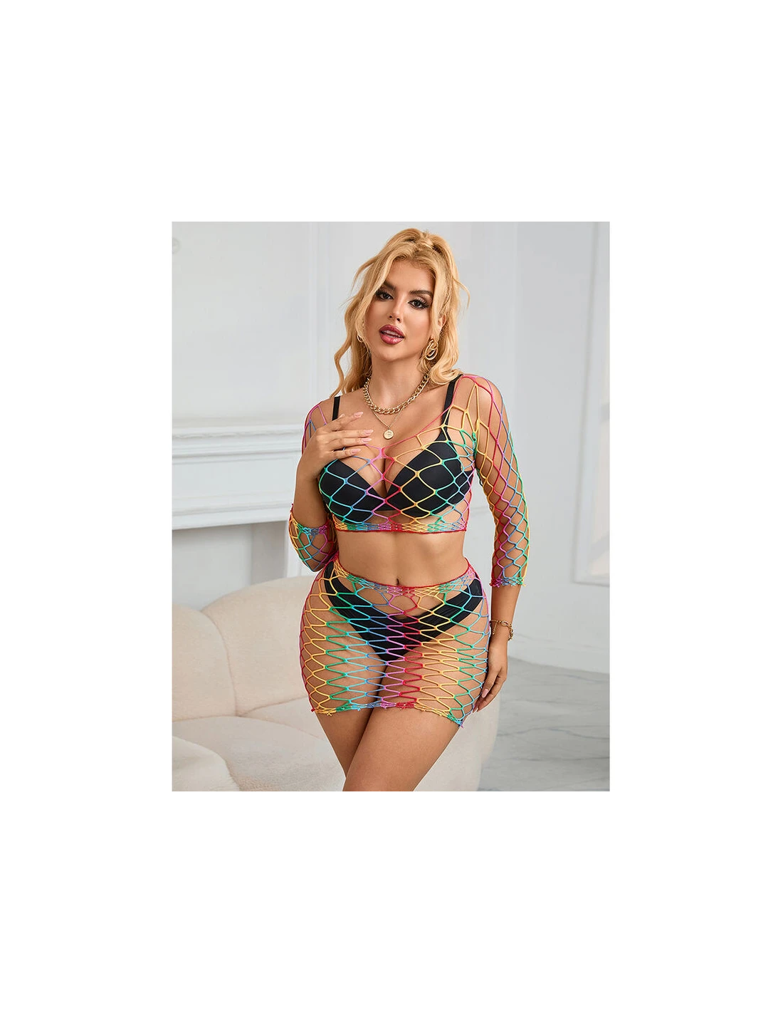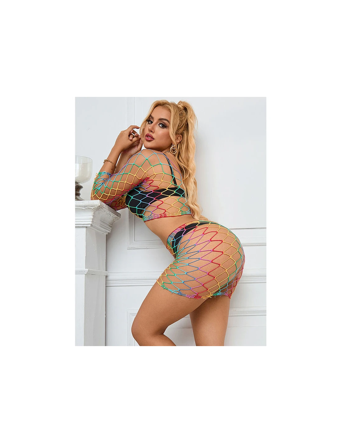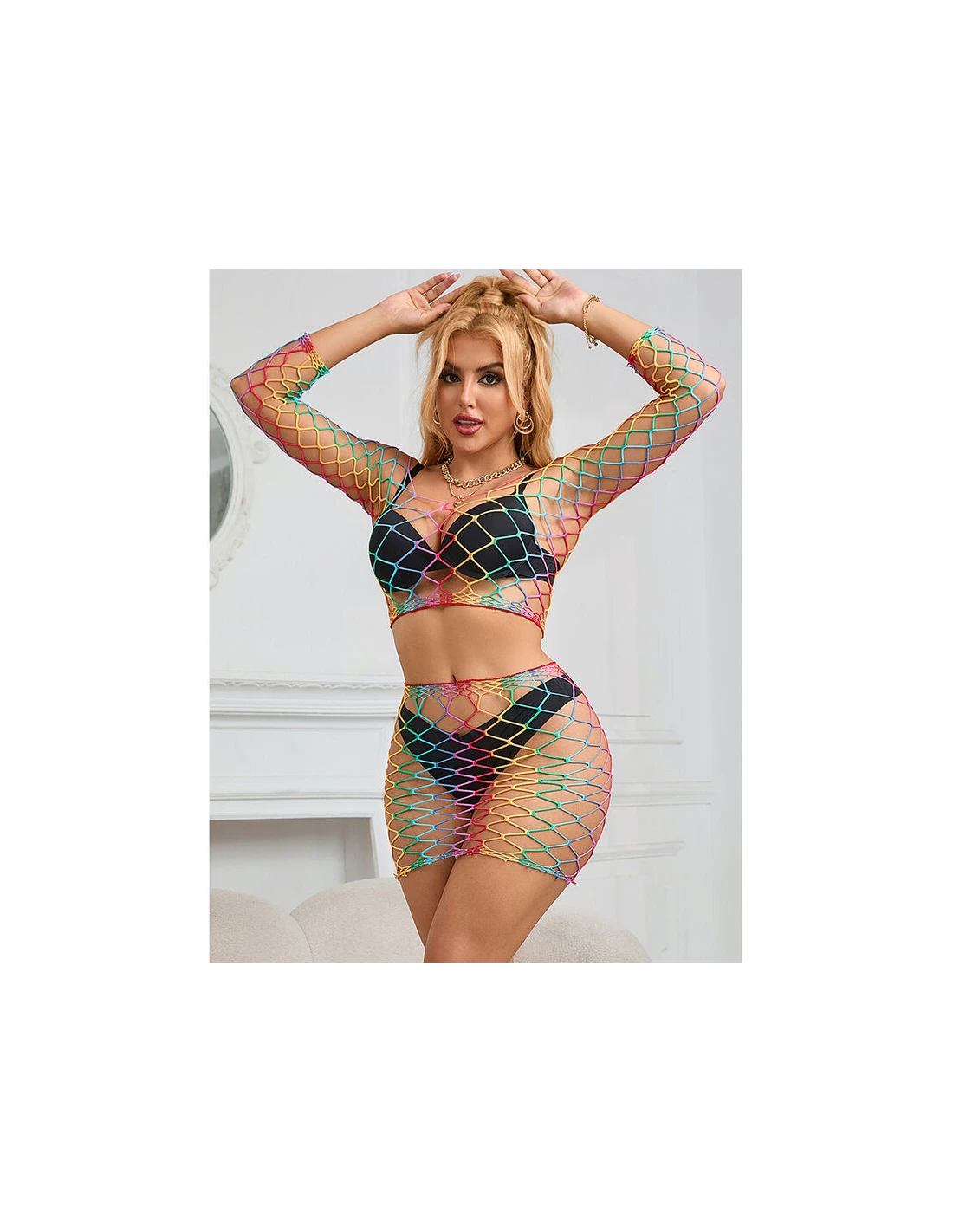 Este body de rejilla en dos piezas con colores arcoíris es una prenda que equilibra perfectamente estilo, comodidad y versatilidad.