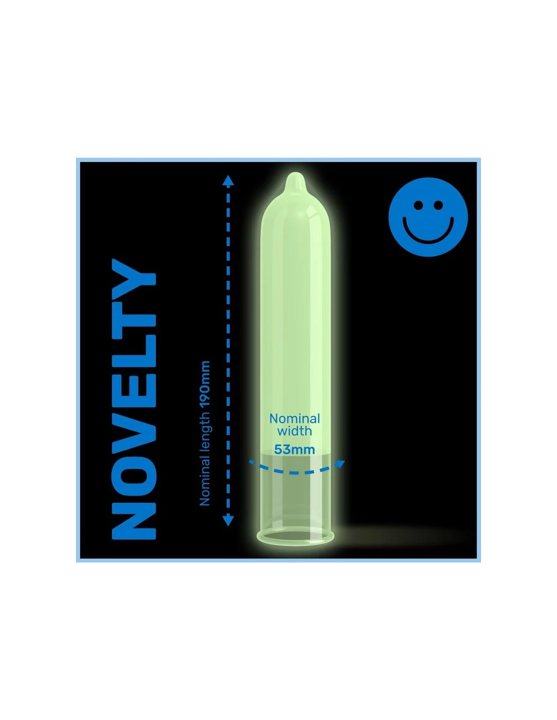 Los condones Pasante Glow brillarán en la oscuridad después de ser expuestos a la luz. Liso.