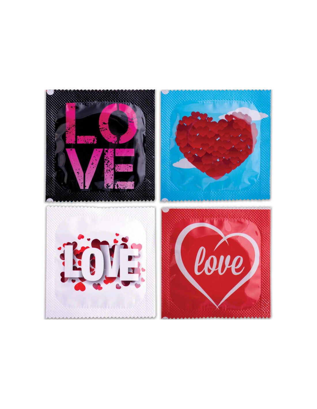 Preservativo love de la marca Pasante ofrecen simplicidad en las formas: comodidad y sensación. Contiene preservativos con 4 símbolos del amor: corazones y letras de amor. Ideales para repartir en fiestas de enamorados, bodas o día de San Valentín.