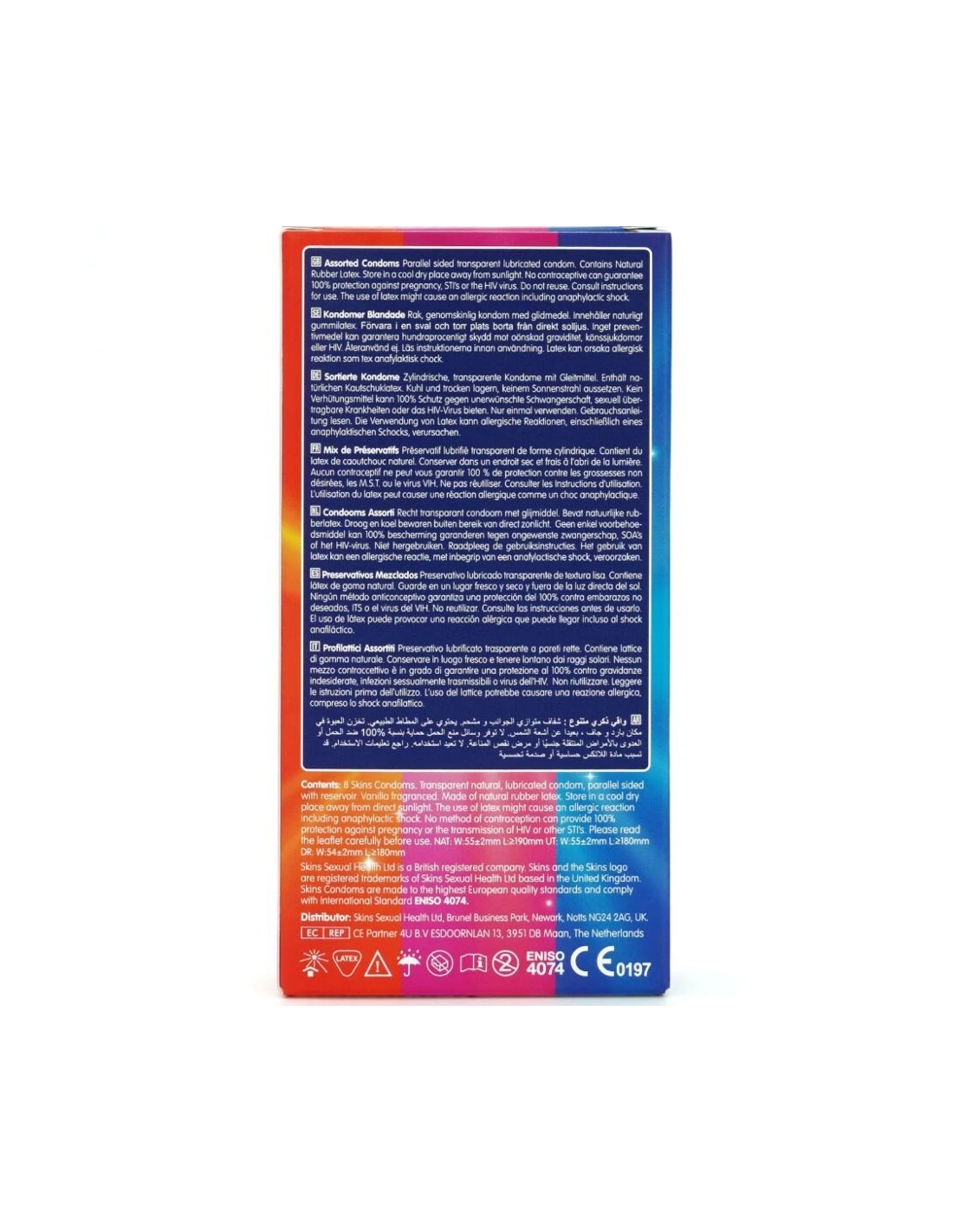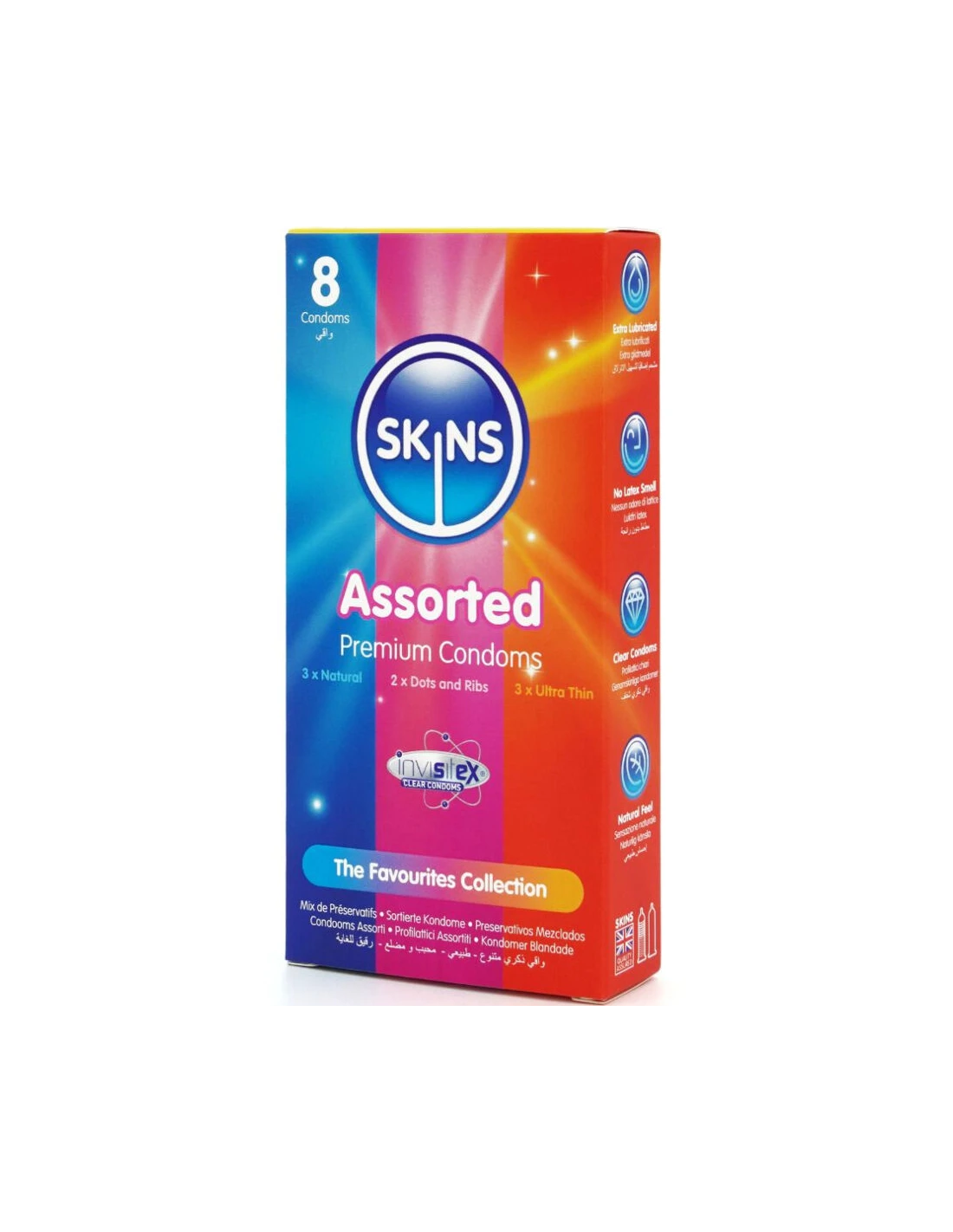 El paquete surtido de 8 Skins es una opción económica y lista para usar que ofrece hasta un 33 % más de condones por paquete que el líder del mercado. Está diseñado para aportar variedad y emoción al pasillo de condones. Este multipack cuidadosamente seleccionado incluye tres de los estilos de condones más populares de Skins: Natural, Dots & Ribs y Ultra Thin, lo que ofrece a los clientes una selección versátil para diferentes preferencias y experiencias de placer.