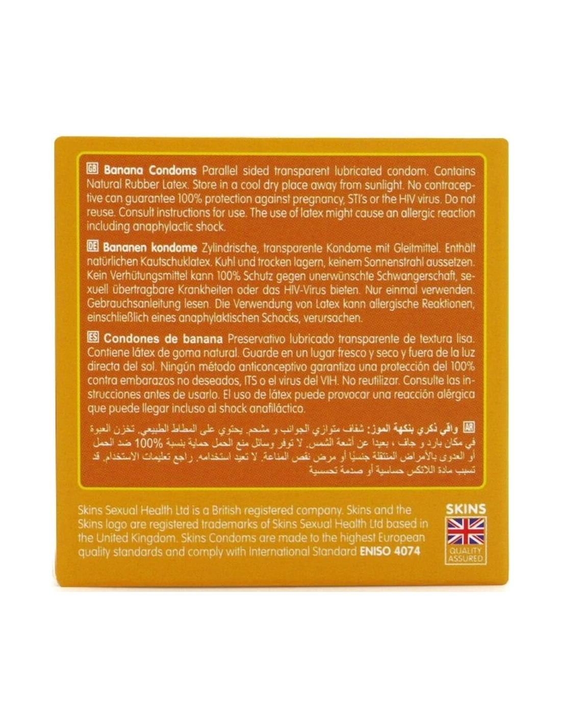¡Deleite su paladar con la sensación de sabor de los condones Skins sabor plátano! 4 condones con sabor a plátano envueltos individualmente para facilitar su uso. ¡Luce bien! ¡Siéntete bien! Disfruta de un sexo naturalmente mejor con un condón que se siente como parte de ti. Tan transparente y fino que se siente como una segunda piel. ¡Los condones Skins te permiten disfrutar de forma segura sin sacrificar el placer!