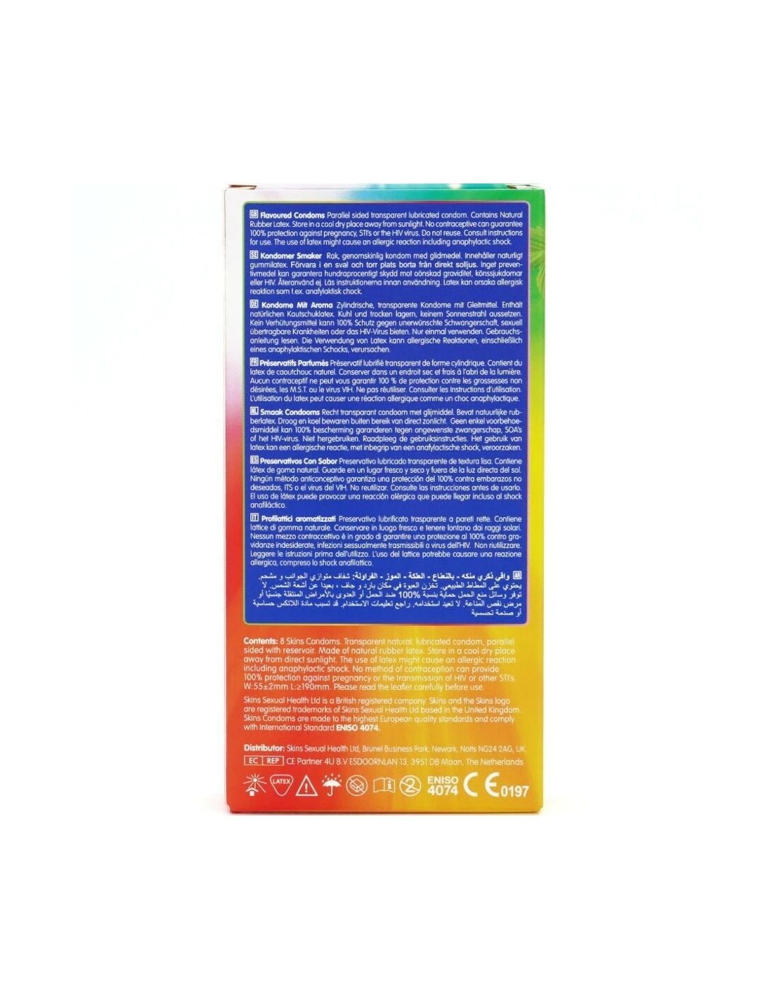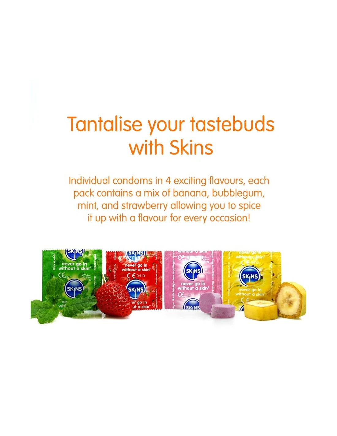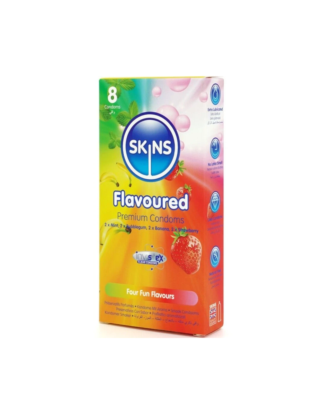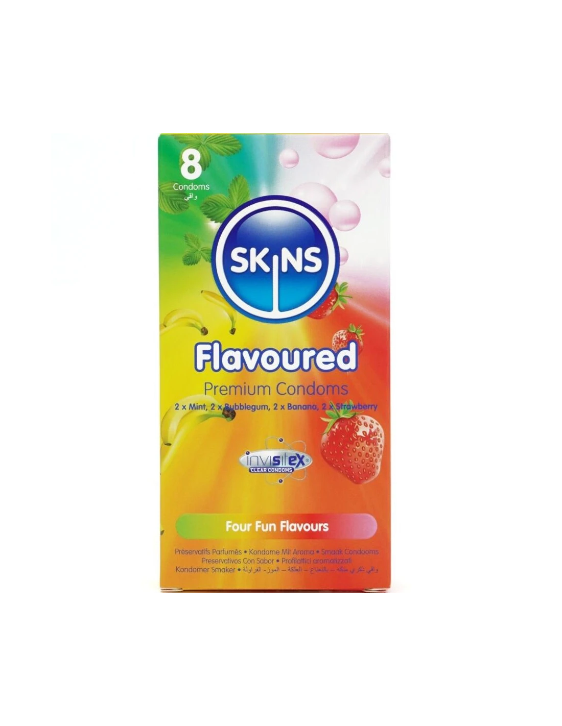 Presentamos el pack de 8 con sabor Skins: una solución elegante y lista para usar que ofrece hasta un 33 % más de condones por pack que el líder del mercado. Este emocionante multipack incluye cuatro atractivos sabores: plátano, chicle, menta y fresa, ofreciendo a los consumidores una forma divertida y sabrosa de mejorar la intimidad en cualquier ocasión. Cada condón está envuelto individualmente y elaborado con látex natural de primera calidad, lo que proporciona una sensación natural, transparencia y resistencia. Enriquecidos con lubricación extra y deliciosas fragancias, estos condones eliminan el olor típico del látex para garantizar una experiencia más placentera.