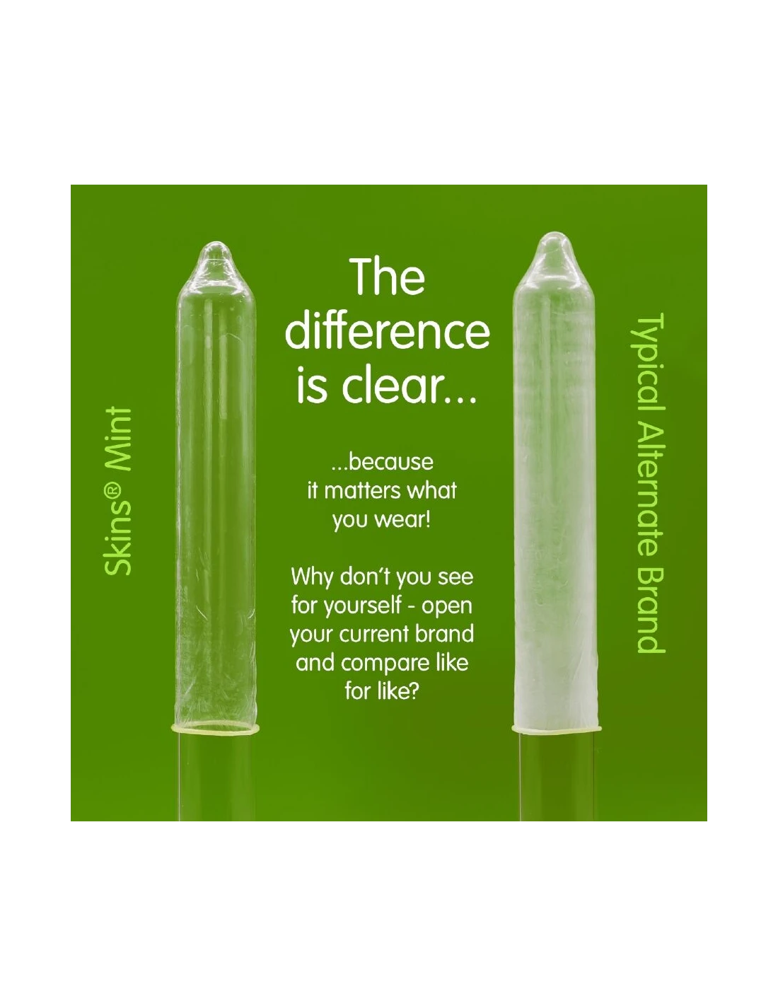 Presentamos el Skins Mint 8-Pack: un formato elegante y listo para la venta que ofrece hasta un 33 % más de condones por paquete que el líder del mercado, brindando un valor excepcional y un atractivo destacado en la góndola. Diseñados para una experiencia de sexo oral más placentera, estos condones tienen un sabor a menta fresca y están hechos de látex natural de primera calidad para mayor claridad, resistencia y una sensación natural. Ultrafinos para una mayor intimidad, están diseñados para sentirse como una segunda piel, a la vez que brindan protección y comodidad confiables.