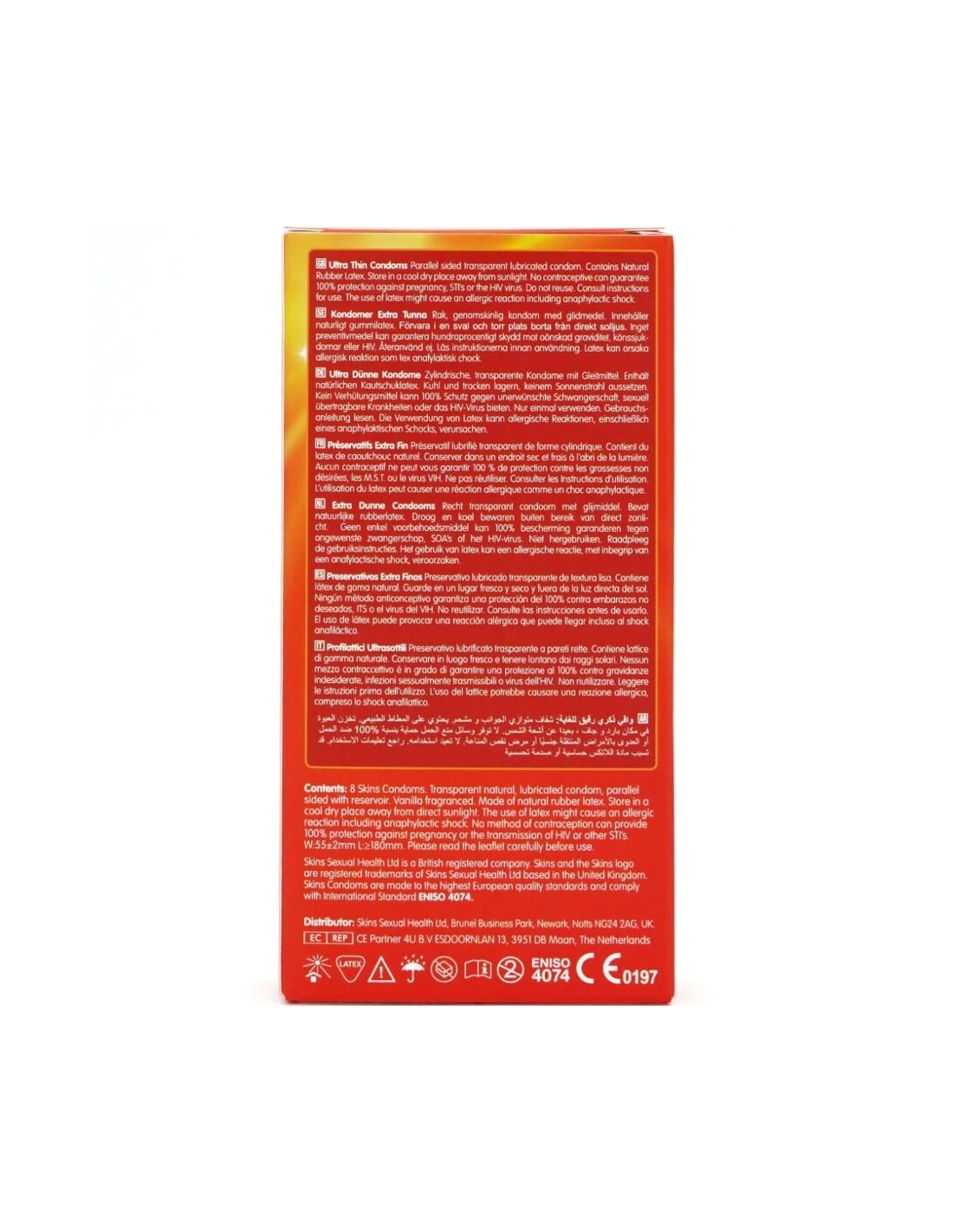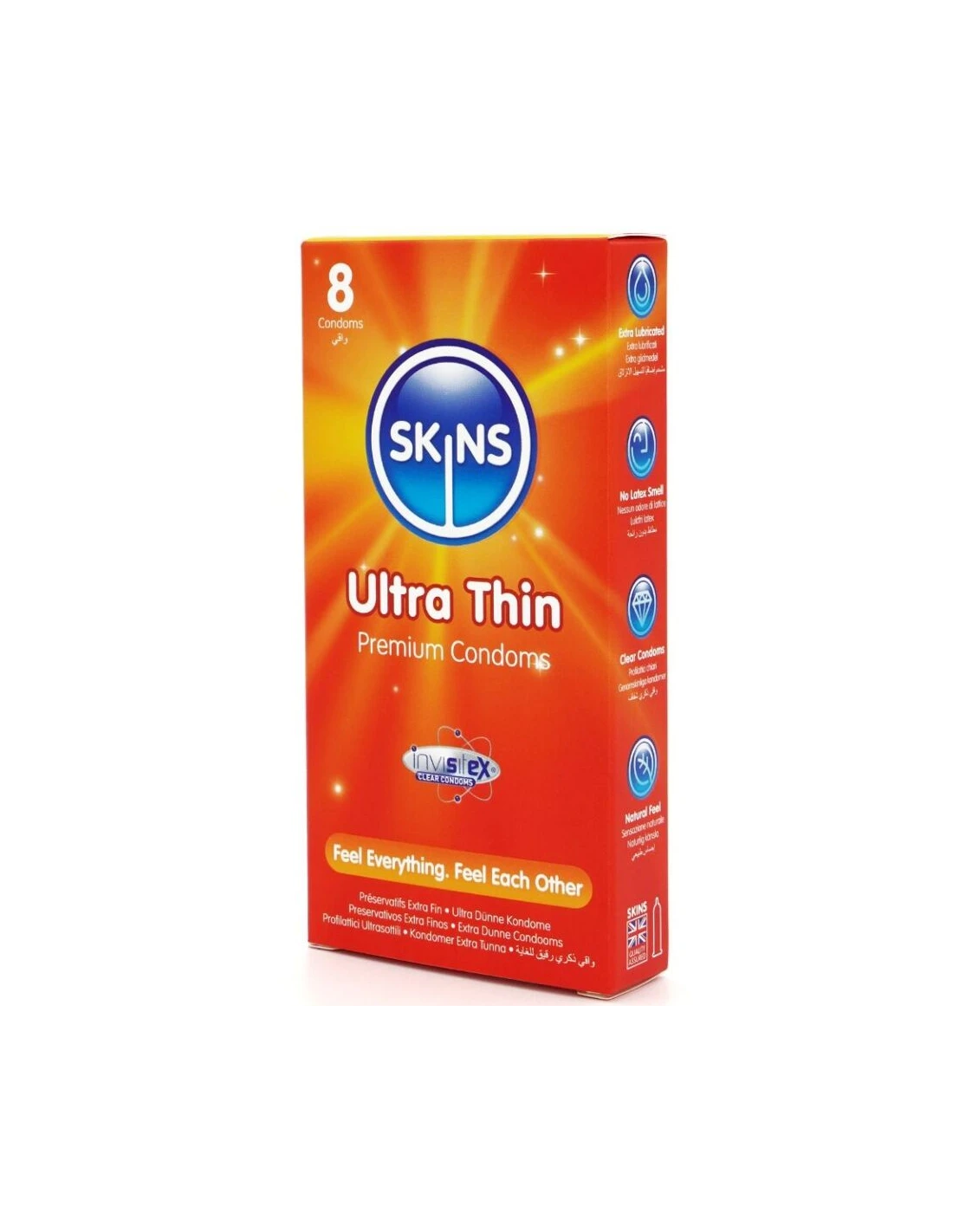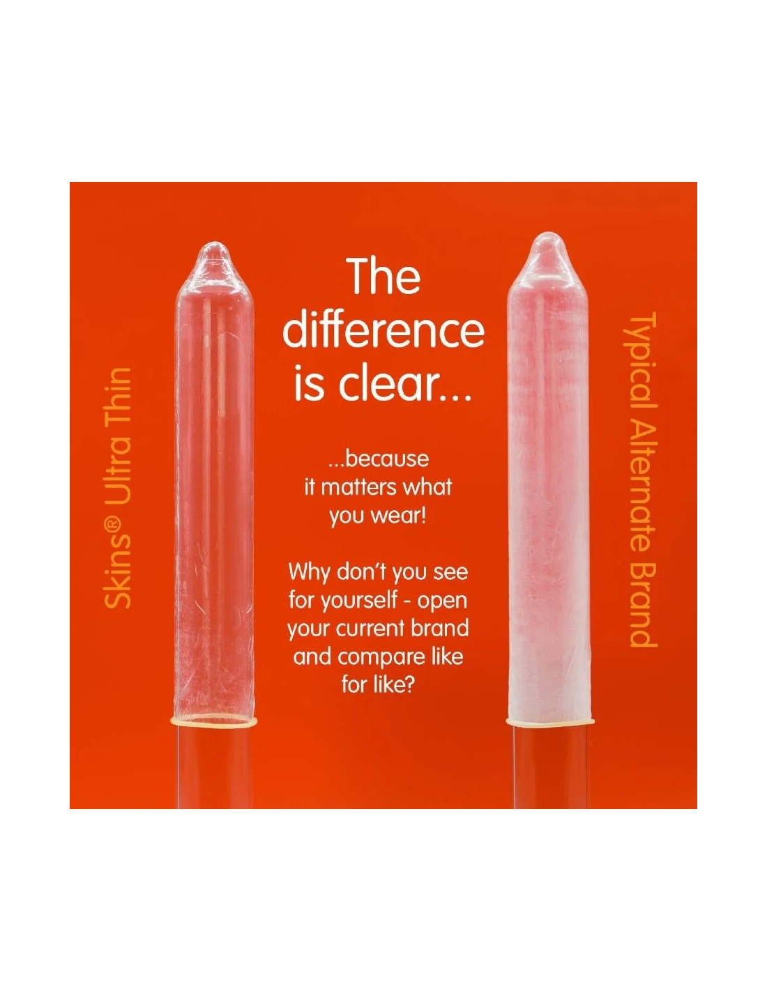 Presentamos el Skins Ultra Thin 8-Pack: un producto económico y listo para usar que ofrece hasta un 33 % más de condones por paquete que el líder del mercado. Diseñado para clientes que buscan la máxima intimidad con protección confiable, este paquete es ideal para tiendas que buscan un producto esencial premium y de alto rendimiento. Los condones Skins Ultra Thin ofrecen todas las ventajas de Skins Natural, pero con un diseño aún más fino para una mayor sensación de intimidad. Fabricados con látex natural de primera calidad, ofrecen resistencia, transparencia y una sensación de segunda piel, lo que los convierte en la opción ideal para quienes priorizan la sensación. Siéntete aún más cerca de tu pareja con el condón Skins Ultra Thin, resistente pero increíblemente fino. Con todas las características de Skins Natural, pero aún más fino, usar un Skins Ultra Thin es tan parecido a una segunda piel.