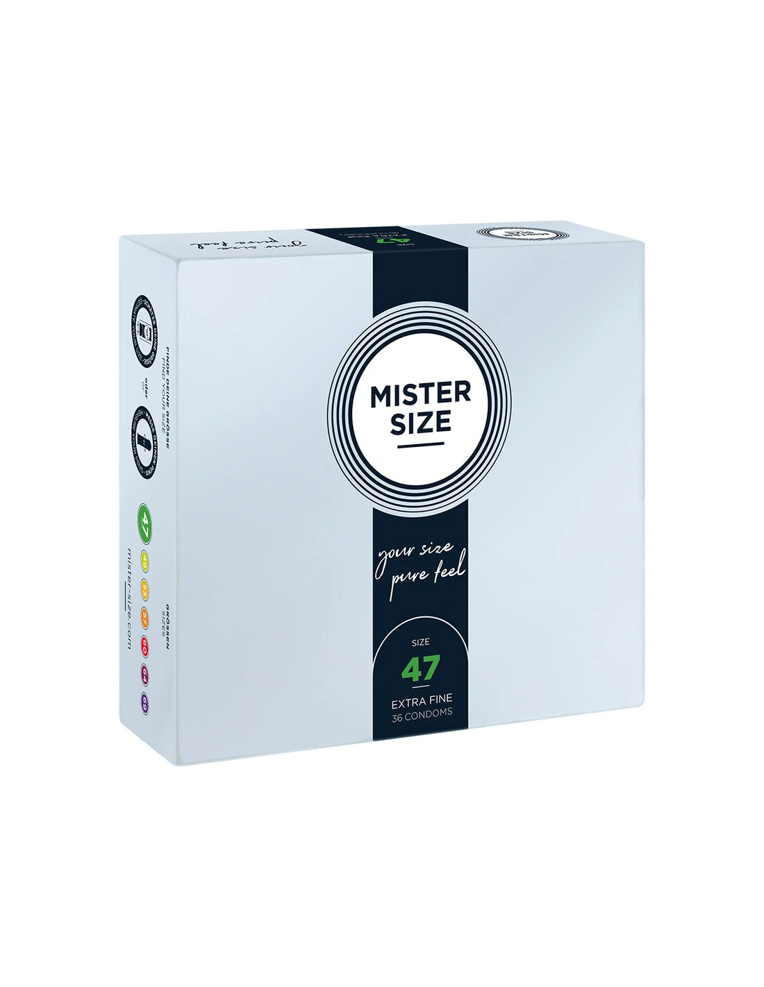El MISTER SIZE 47 es el más pequeño de nuestros siete tamaños. Sin embargo, esto no tiene por qué ser incómodo para usted. El pene más delgado permite una mayor flexibilidad durante el sexo y puede brindarle las mejores sensaciones; especialmente con la preparación adecuada.