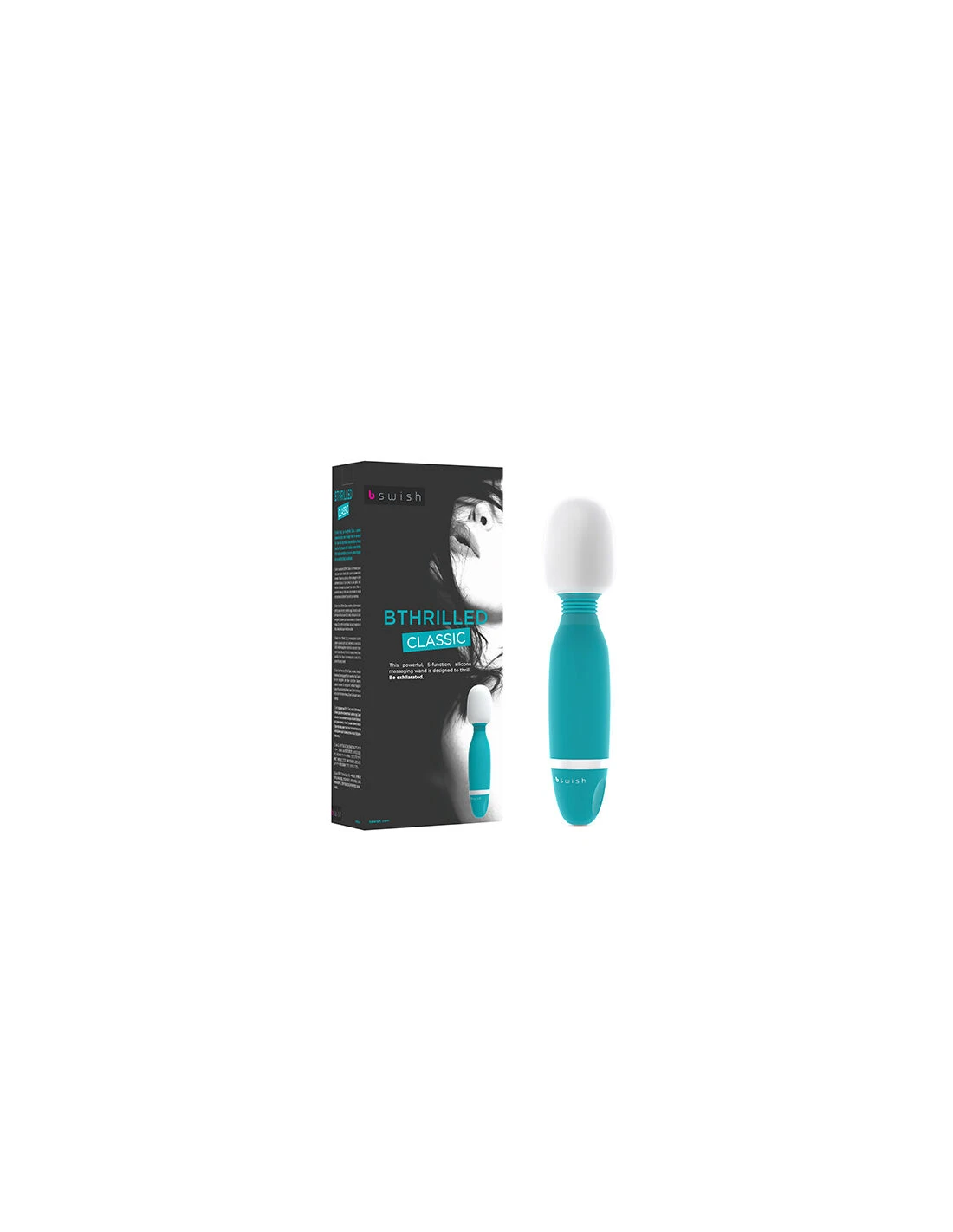 B Swish te trae el Bthrilled Classic, un poderoso y placentero masajeador de varita listo para la diversión impermeable. Disfruta de la suave y sedosa cabeza de masaje de silicona para el cuerpo y encuentra placer con 5 funciones de masaje. ¡Con infi nitas posibilidades, deja que tu imaginación o la de tu compañía se desborde! Estremécete, estimúlate.