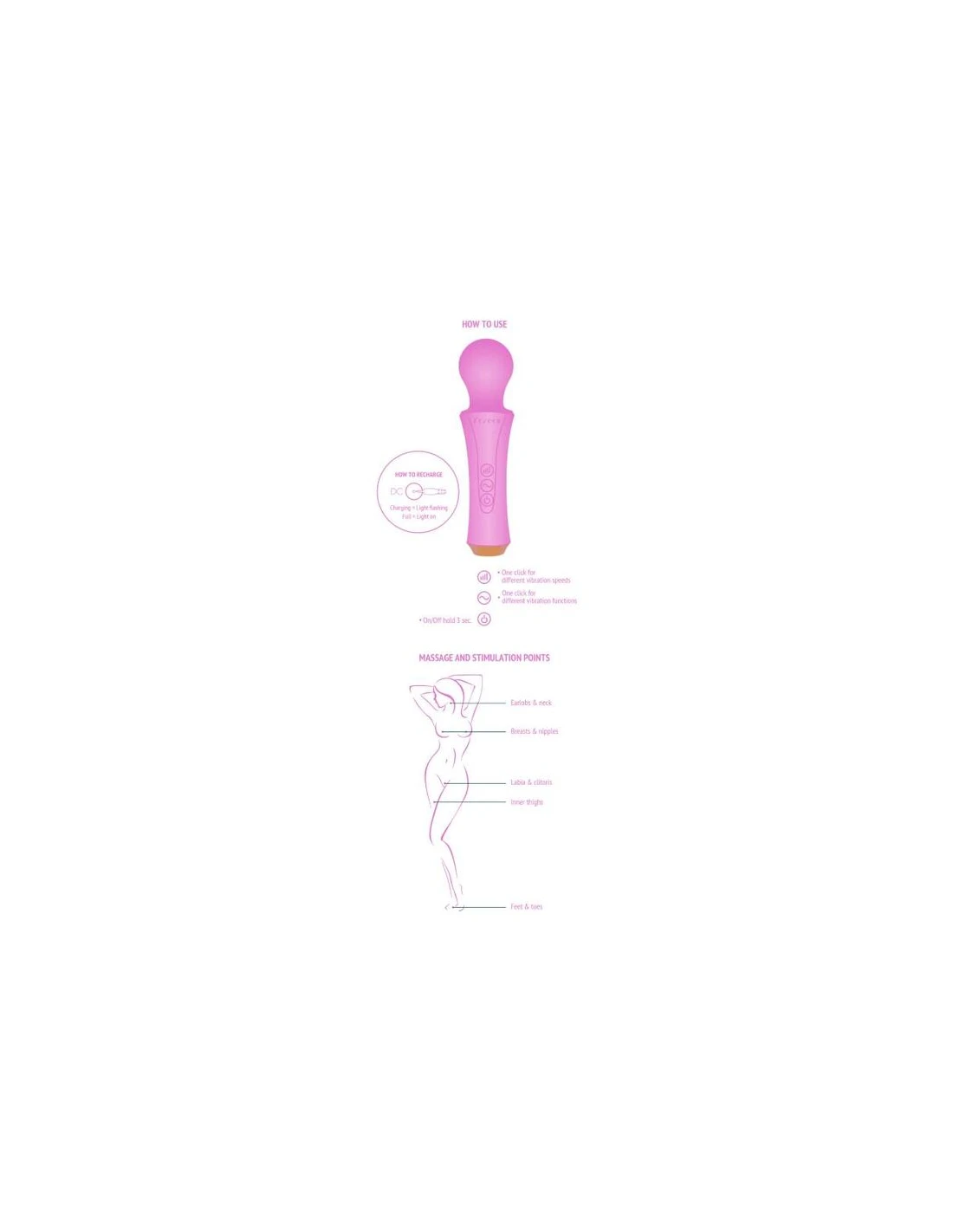 Combínalo con los accesorios de silicona para disfrutar aún más. Da una estimulación precisa a las zonas erógenas, como el cuello, los pezones y el clítoris, pero también a la vagina. Los accesorios de silicona se venden por separado.