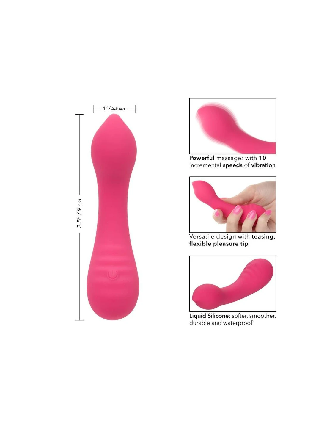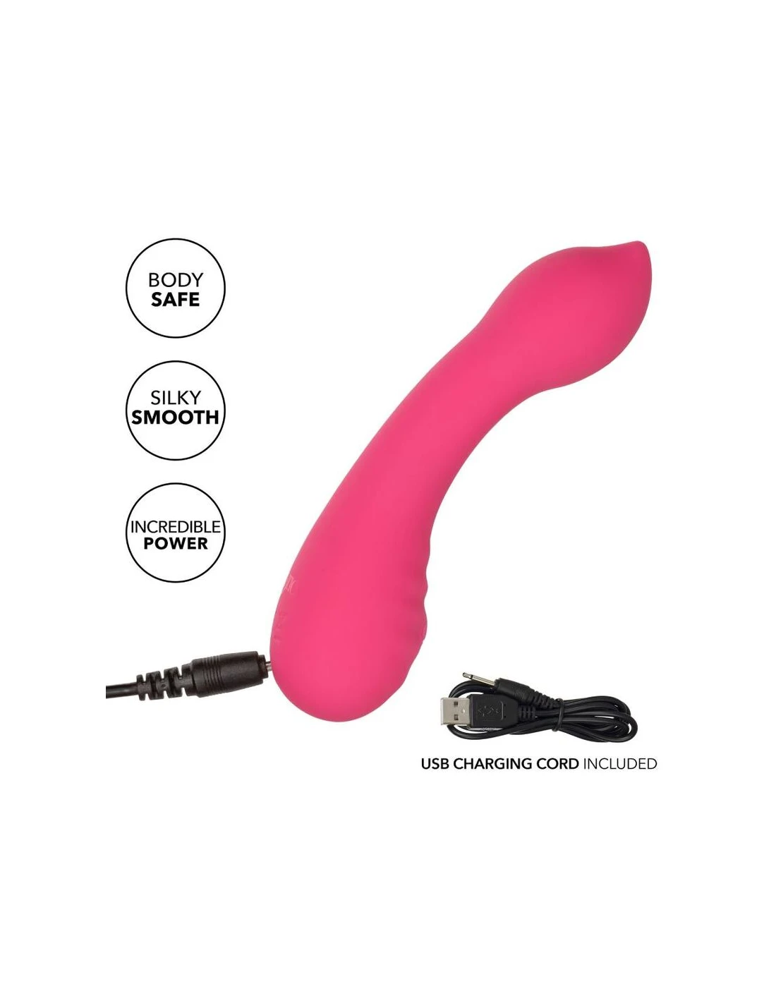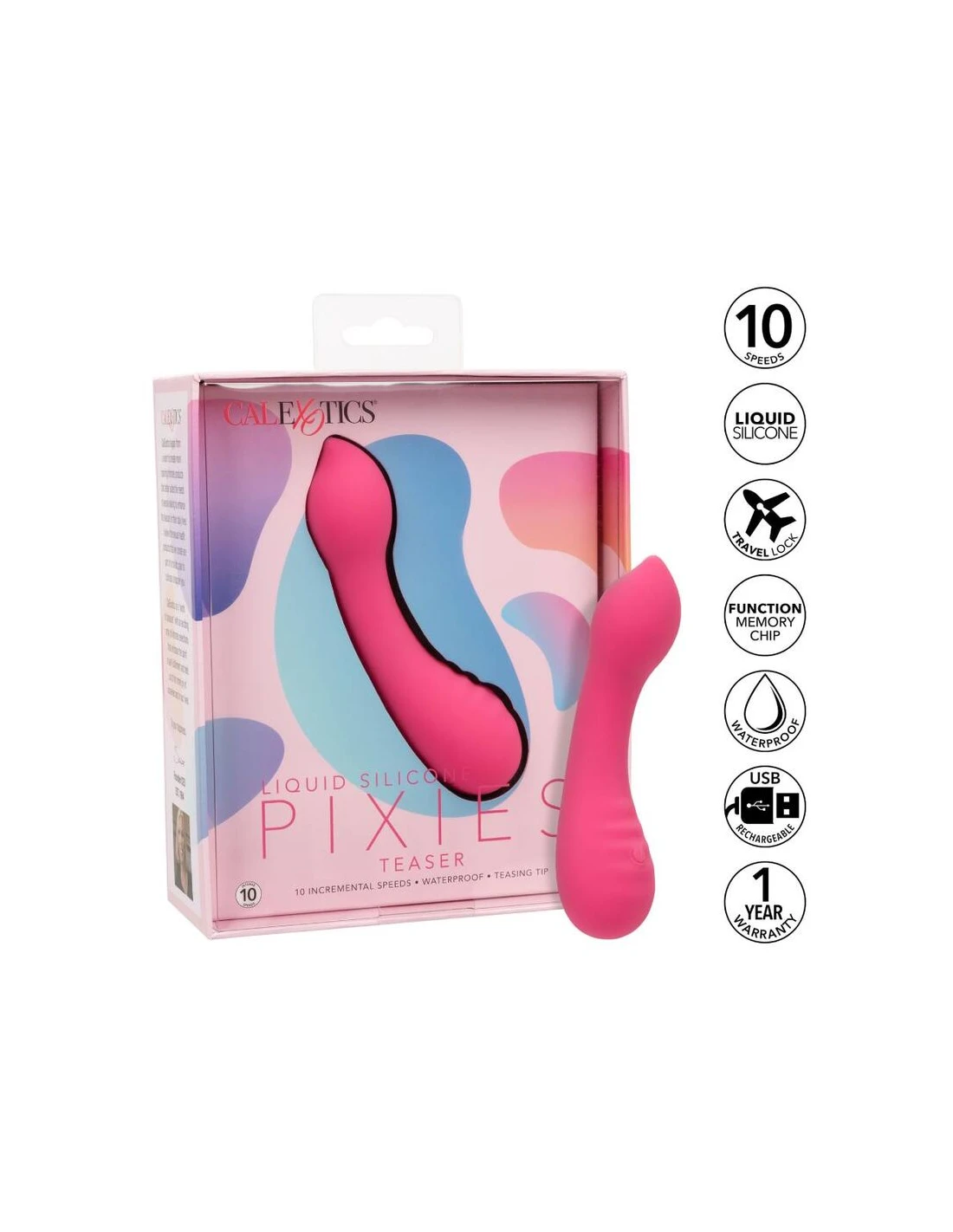 El teaser de Pixies de silicona líquida está diseñado para ofrecer una sensación de sacudida de rodilla a sus puntos de placer favoritos. La punta de placer sensualmente curvada, el diseño de doble cara y las 10 velocidades emocionantes de vibraciones hacen que este sea el compañero de viaje perfecto. El masajeador curvo se ajusta en su mano para permitirle entregar tentalización precisa y emocionar con vibraciones contorneadas. Obtenga juguetón con cada aumento de las 10 velocidades incrementales de vibración con el botón de control de fácil toque. Control sin esfuerzo El placer puro con un botón de silicona de fácil toque y mantenga presionada durante 3 segundos para encenderse o desactivarse. La silicona líquida ultra-plush y la punta única flexible son excelentes para explorar puntos dulces sensuales y puntos de placer íntimos con facilidad. Con una forma suave y una superficie flexible, podrá disfrutar de vibraciones emocionantes desde cualquier ángulo que desee. Use el control suave de un solo botón para disfrutar de hasta 110 minutos de placer vibrante. Cargue su pasión en solo 1,5 horas conectando el cable USB proporcionado al puerto de carga de auto-selección en la base del masajeador. El tamaño discreto del masajeador delgado lo convierte en el compañero de viaje perfecto, lo que le permite adoptar el placer radiante donde sea que te lleven tus fantasías. Velocidades de vibración