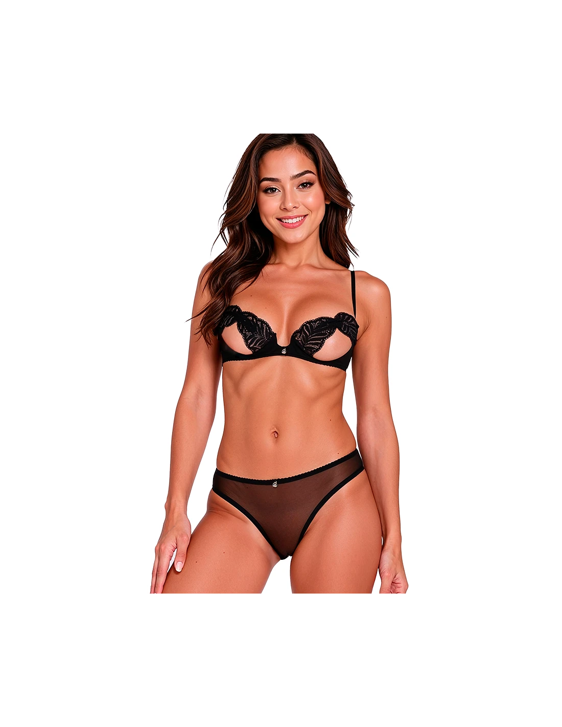 - Incluye: Sujetador abierto de encaje + braguita de malla transparente