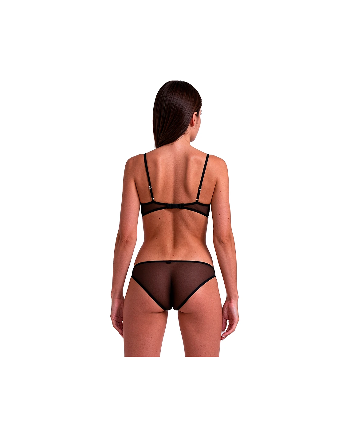 La braguita a juego está confeccionada en malla ligera y transparente, con un fino ribete. Su corte minimalista, complementado con un pequeño detalle decorativo en la cintura, crea un conjunto cohesivo y elegante con el sujetador.