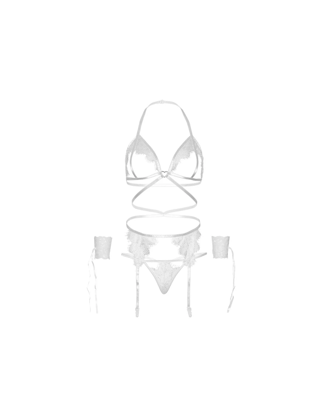 LEG AVENUE SET CUATRO PIEZAS SUJETADOR LIGUERO TANGA Y PUNOS TALLA UNICA BLANCO
