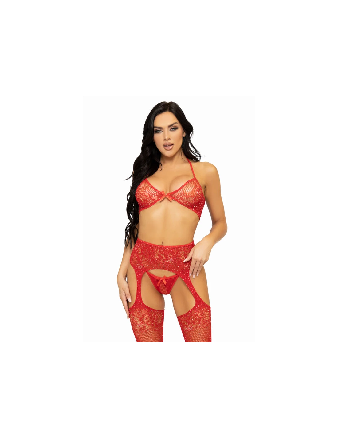 LEG AVENUE SET TRES PIEZAS SUJETADOR TANGA Y MEDIAS TALLA UNICA ROJO