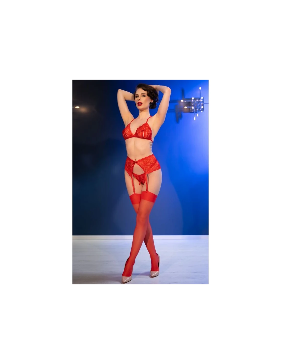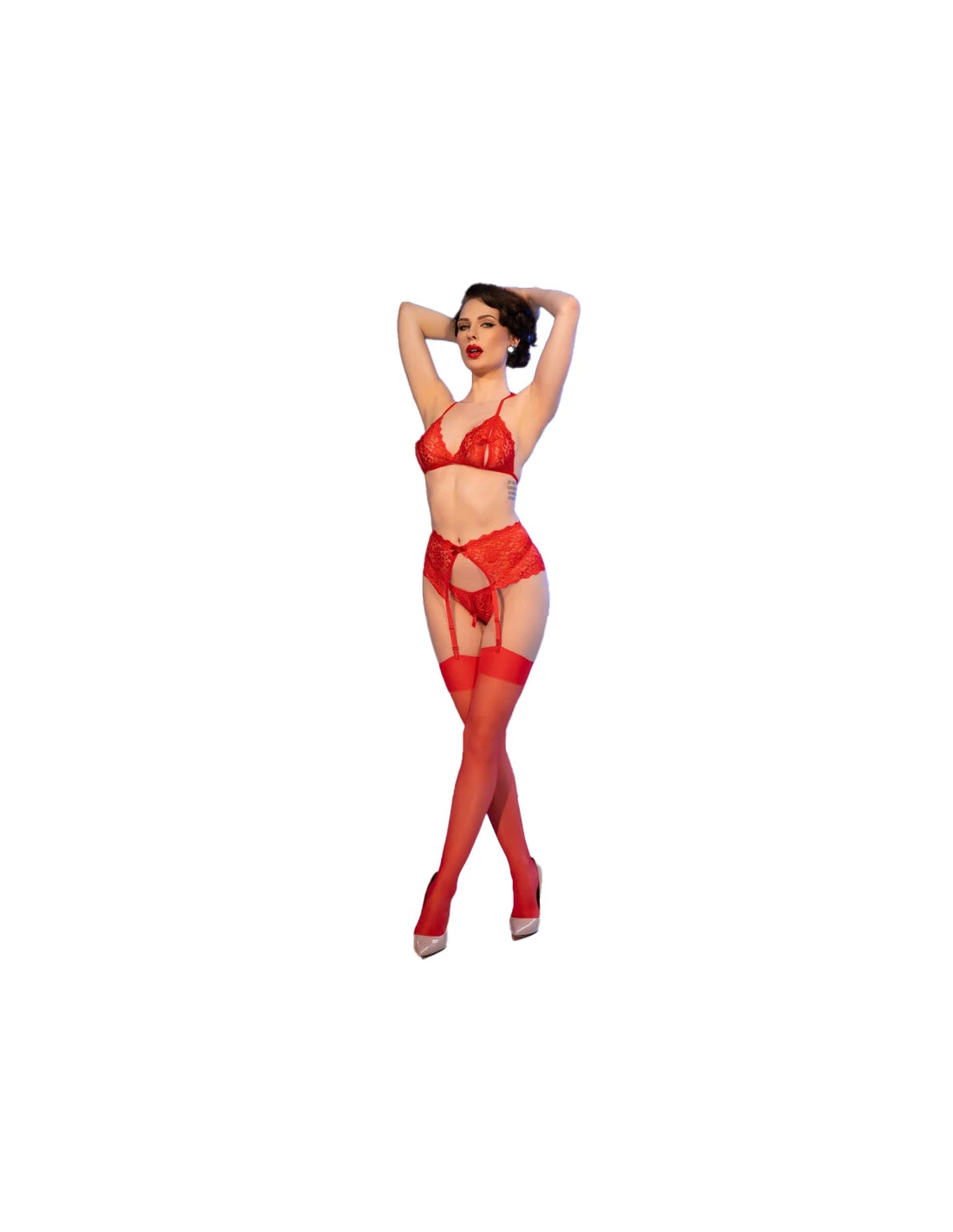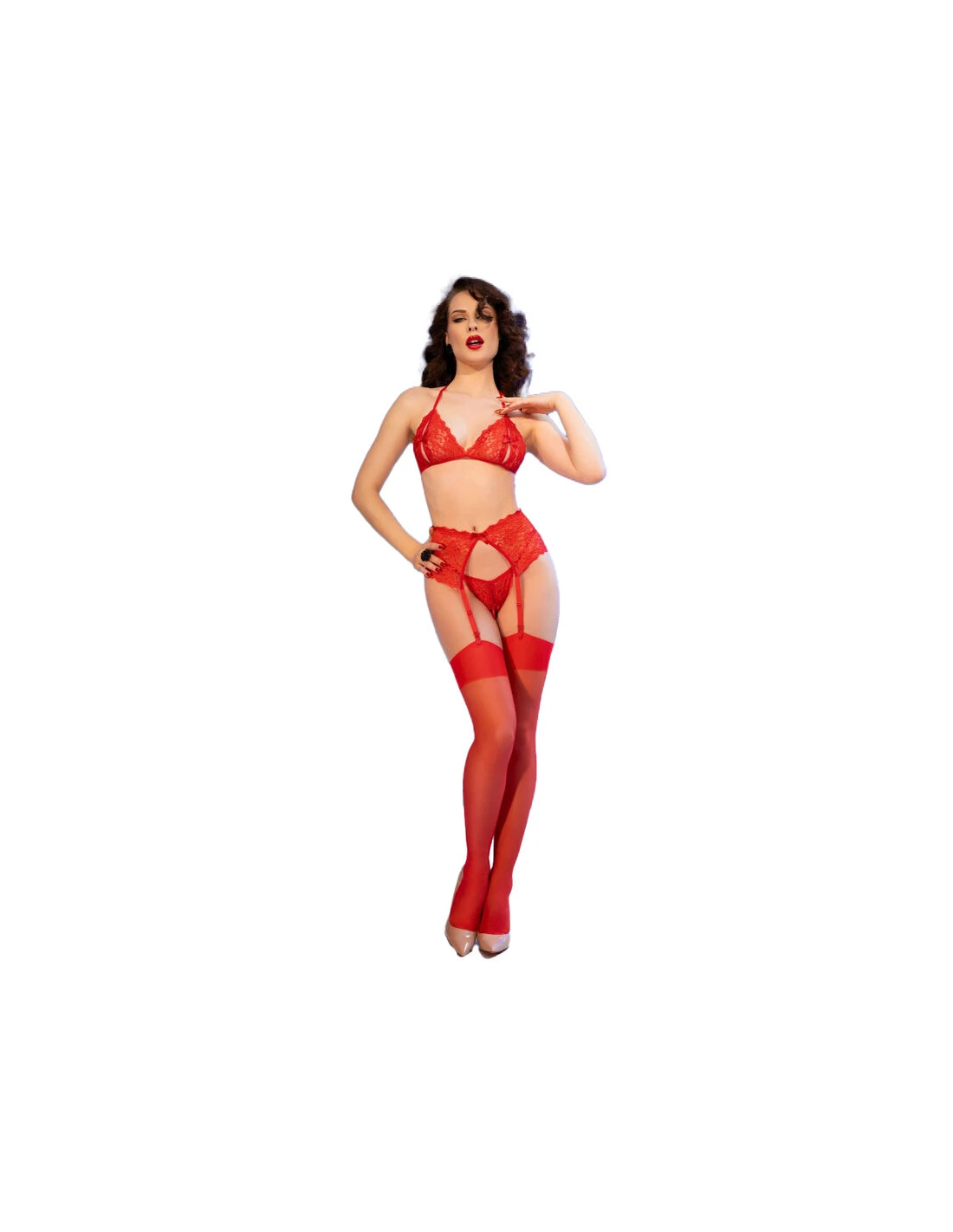 CHILIROSE - CR 4848 SET SUJETADOR + TANGA + MEDIAS DE ENCAJE ROJO S