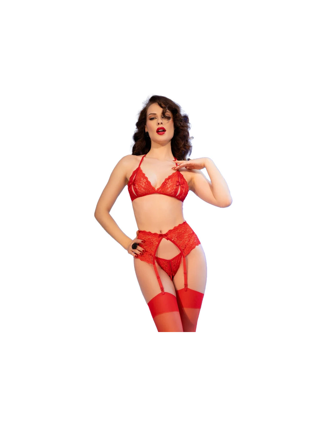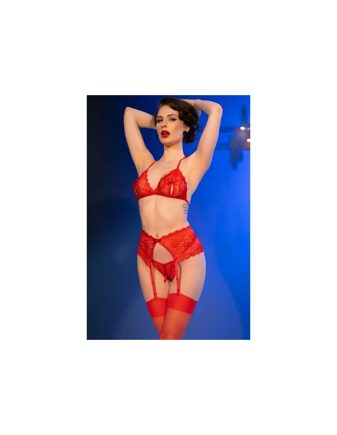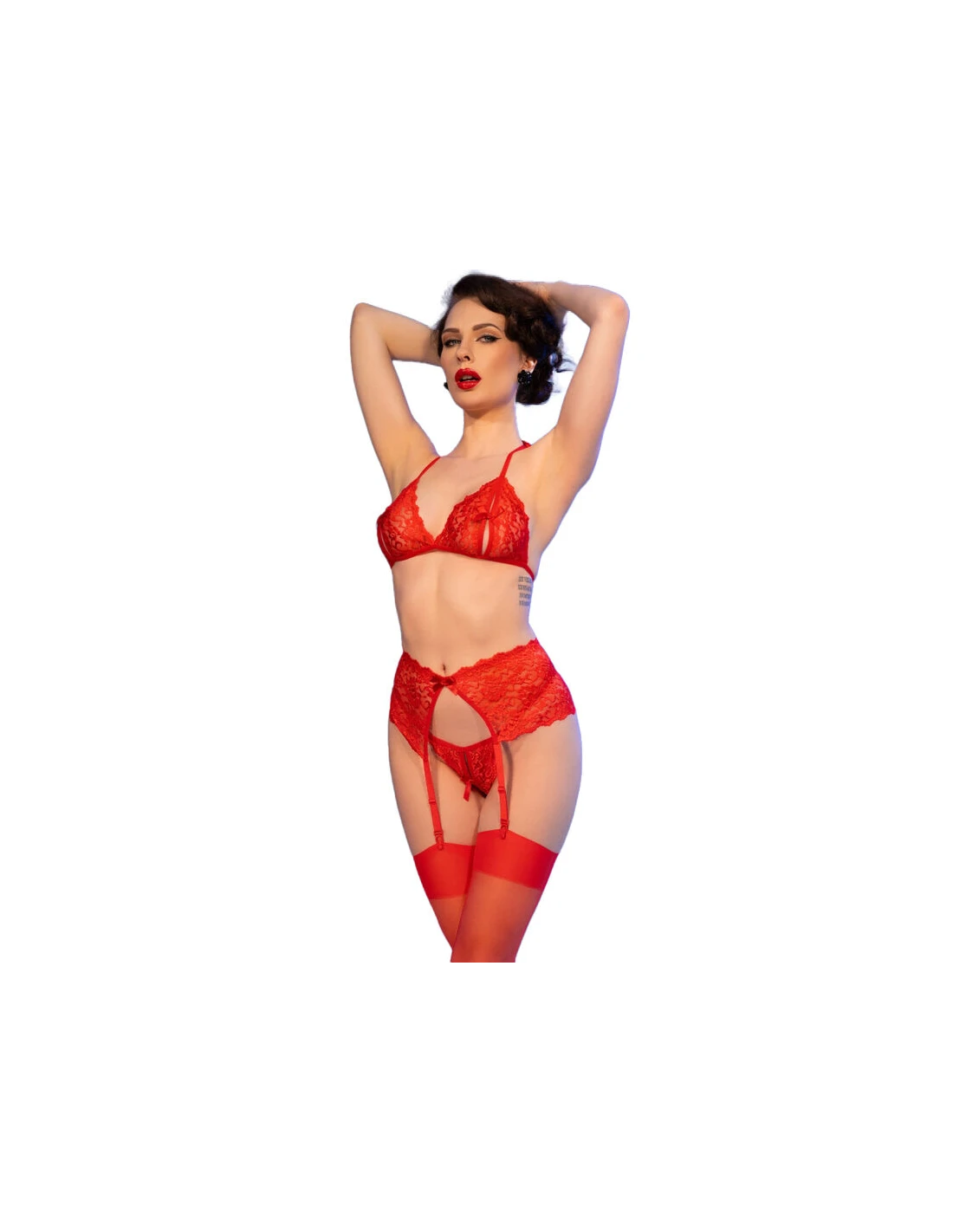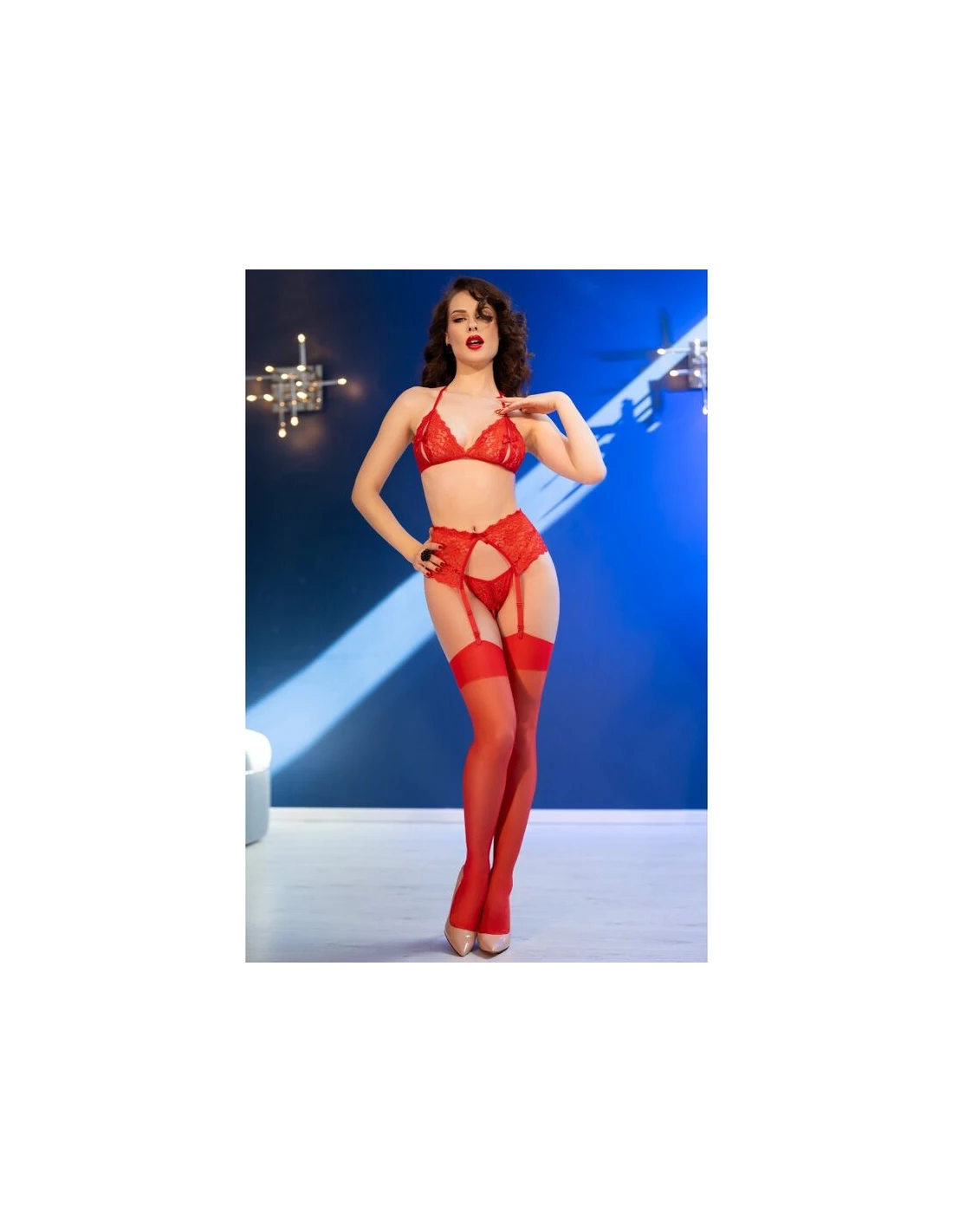 CHILIROSE - CR 4848 SET SUJETADOR + TANGA + MEDIAS DE ENCAJE ROJO S