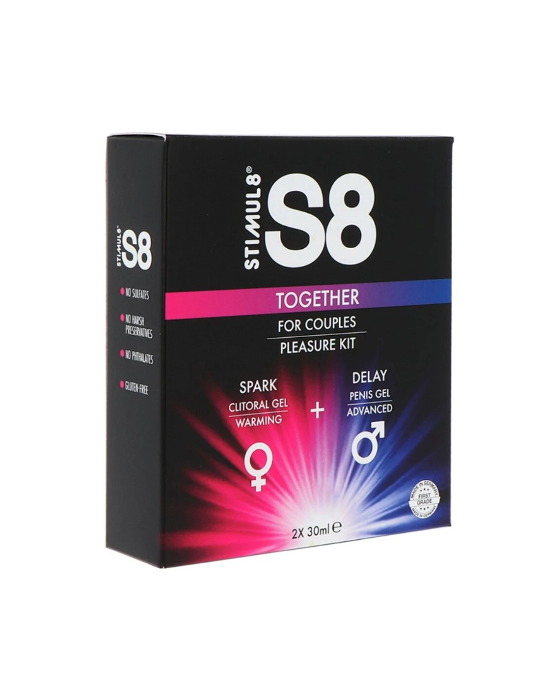 Comparte la diversión con el Kit Together de S8. ¿Buscas productos de cuidado íntimo que las parejas puedan disfrutar juntas? Entonces te encantará el nuevo Kit Together de S8. Este set incluye el atractivo gel para el clítoris S8 Spark para ella y el gel retardante S8 para él. Al combinarlos en una sola sesión de pasión, Spark electrizará los sentidos femeninos y las zonas erógenas, mientras que Delay le permite a él alcanzar la excitación más intensa y prolongada. El dúo perfecto: Spark y Delay son una combinación premium para que las parejas exploren sus deseos simultáneamente. Por eso, S8 ha combinado las dos fórmulas en un atractivo set con un gran atractivo para regalar.