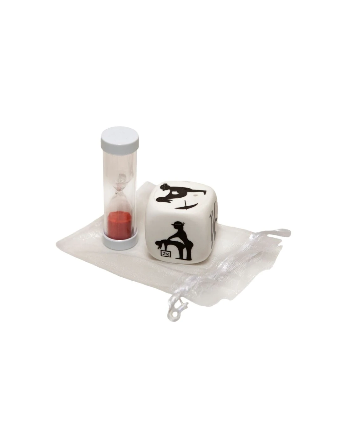 ES UN DADO BLANCO DURO DE GRAN CALIDAD DE 25 mm Y UN RELOJ DE ARENA DE 2 MINUTOS que te marcará el tiempo de la POSTURA que salga. VA EN UNA BOLSITA DE SEDA TRANSPARENTE. ¡ DADOS DE LA PASIÓN! ¿QUE POSTURA HACEMOS HOY? Disfrutad del azar de los dados, una gran solución para las indecisiones sexuales. Te sorprenderán por su sencillez, puedes llevarlo a cualquier parte y lugar os darán muchas alegrías.