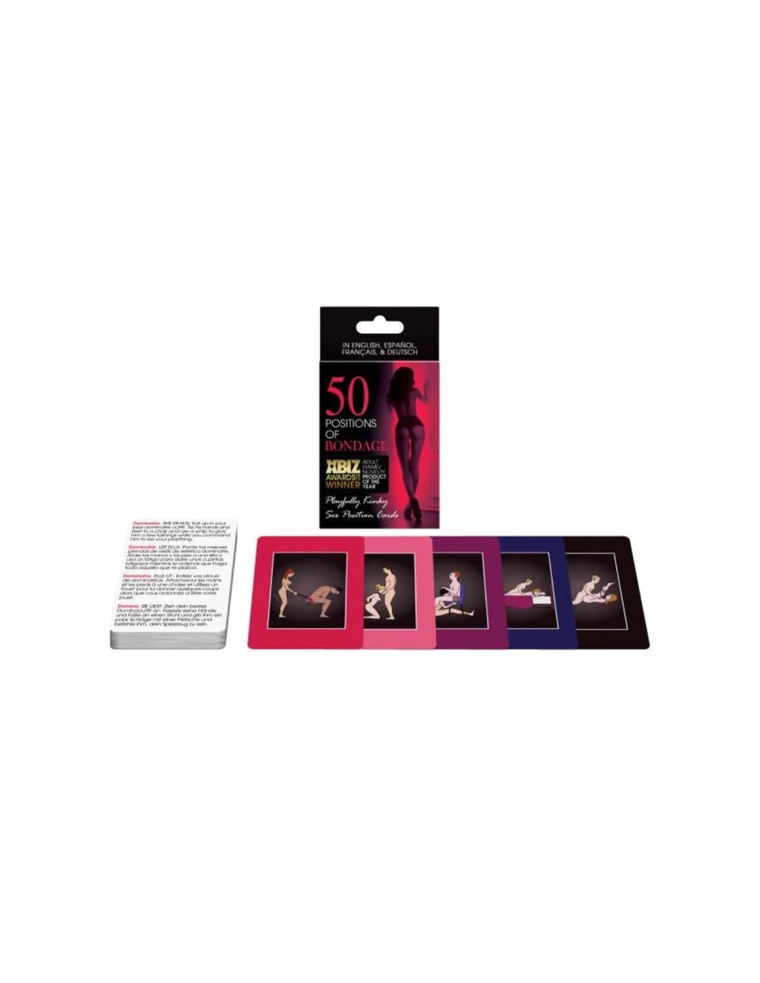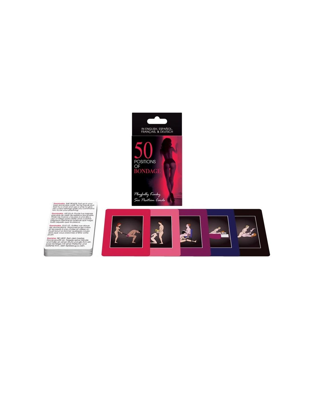 ¡Cartas de posturas sexuales juguetonamente pervertidas! Compite contra tu amante para construir una fantasía de cinco cartas que incluye cinco categorías de desafíos de posturas bodages. Las cartas también se pueden utilizar como tarjetas flash para ideas de posturas sexuales con las que poder experimentar posturas bondage
