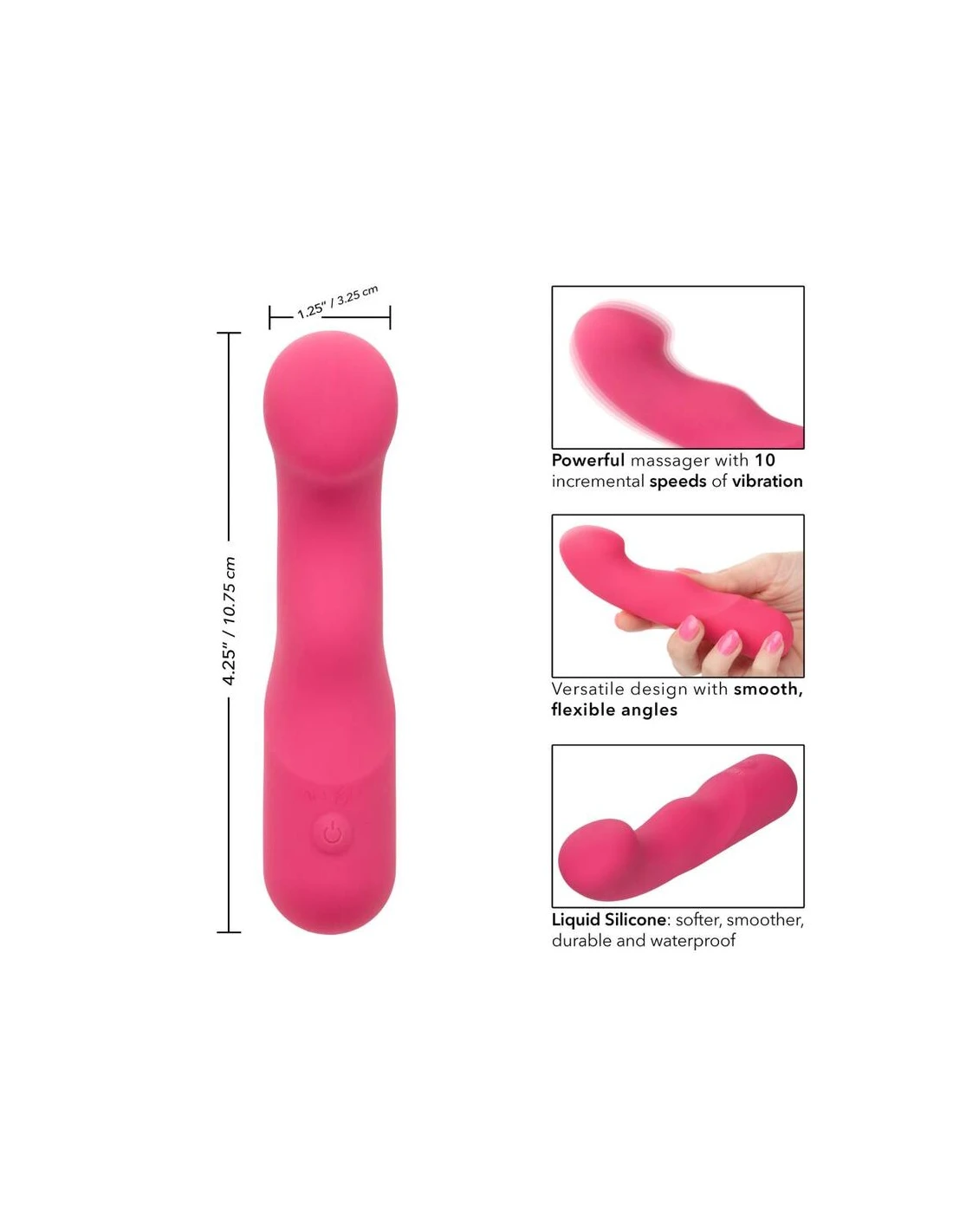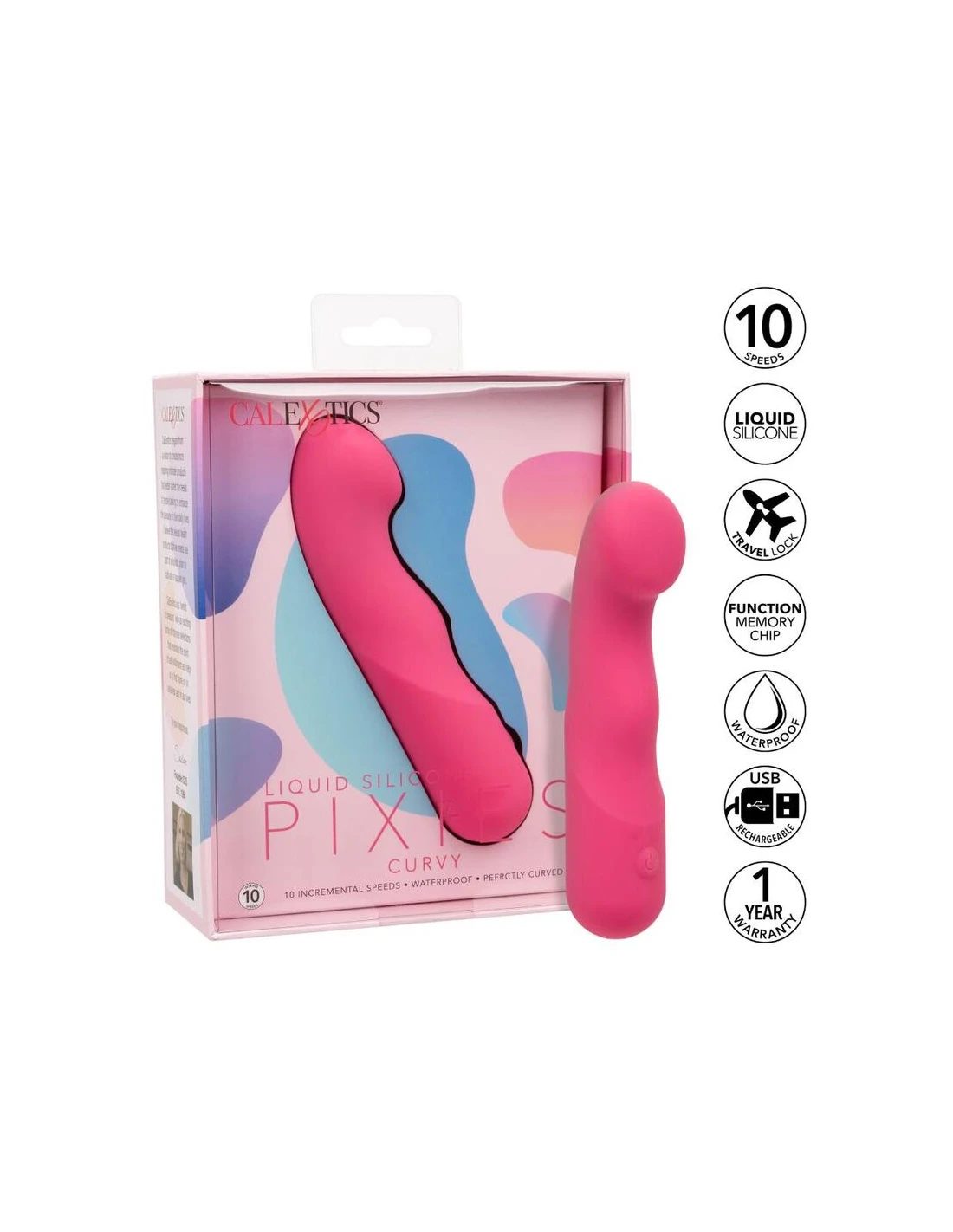 El Curvy Liquid Silicone Pixies está diseñado para ofrecer una sensación de sacudida de rodilla a sus puntos de placer favoritos. La punta en ángulo flexible, el diseño de doble cara y las 10 velocidades emocionantes de vibraciones hacen que este sea el compañero de viaje perfecto. El masajeador curvo se ajusta en su mano para permitirle entregar tentalización precisa y emocionar con vibraciones contorneadas. Obtenga juguetón con cada aumento de las 10 velocidades incrementales de vibración con el botón de control de fácil toque. Control sin esfuerzo El placer puro con un botón de silicona de fácil toque y mantenga presionada durante 3 segundos para encenderse o desactivarse. La silicona líquida ultra-plush y la punta única flexible son excelentes para explorar puntos dulces sensuales y puntos de placer íntimos con facilidad. Con una forma suave y una superficie flexible, podrá disfrutar de vibraciones emocionantes desde cualquier ángulo que desee. Use el control suave de un solo botón para disfrutar de hasta 110 minutos de placer vibrante. Cargue su pasión en solo 1,5 horas conectando el cable USB proporcionado al puerto de carga de auto-selección en la base del masajeador. El tamaño discreto del masajeador delgado lo convierte en el compañero de viaje perfecto, lo que te permite adoptar el placer radiante donde te lleven tus fantasías. 10 velocidades incrementales de vibración