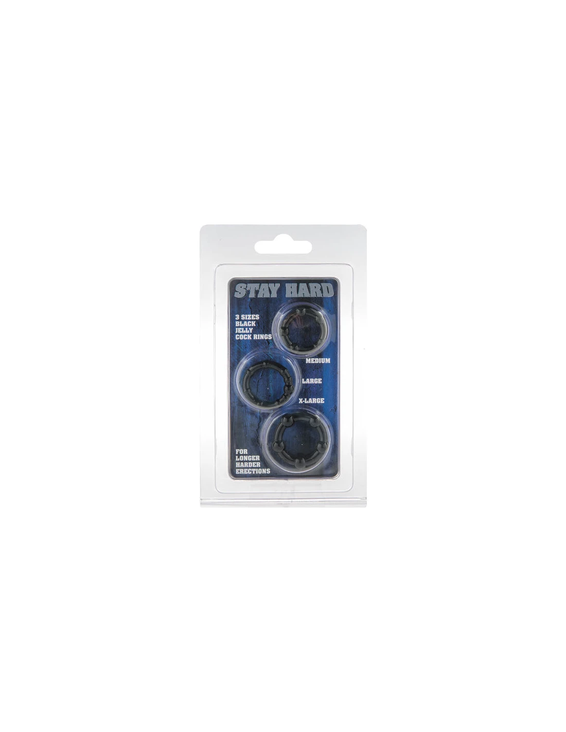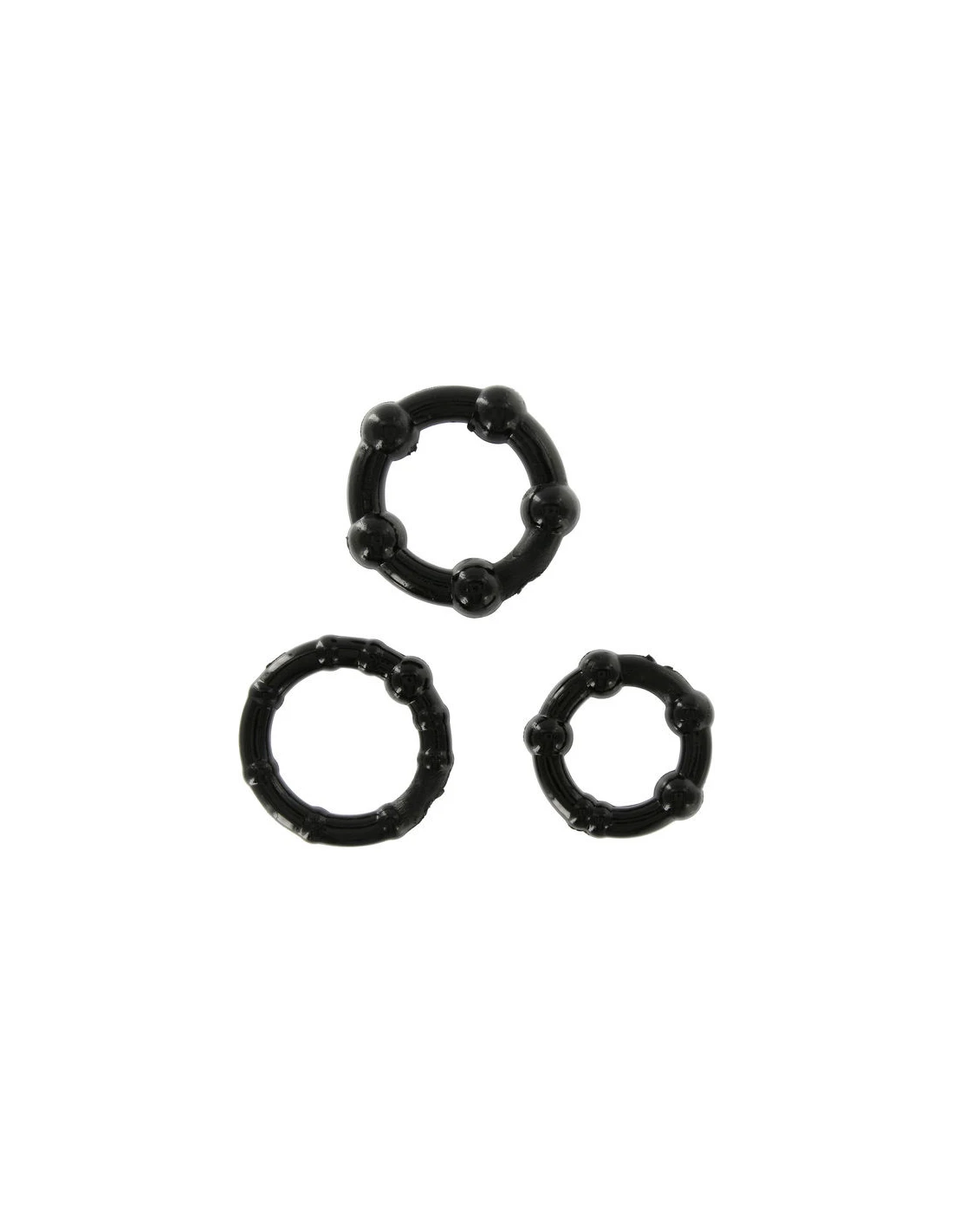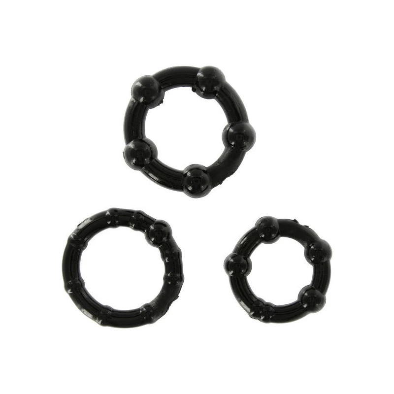 kit de tres anillas de silicona de diferente tamaño, que se adaptan a cualquier tamaño de pene, con los que conseguirás que tu erección sea mucho más duradera, ya que los anillos permiten retardar la eyaculación y mantener tu pene erecto mucho más tiempo.