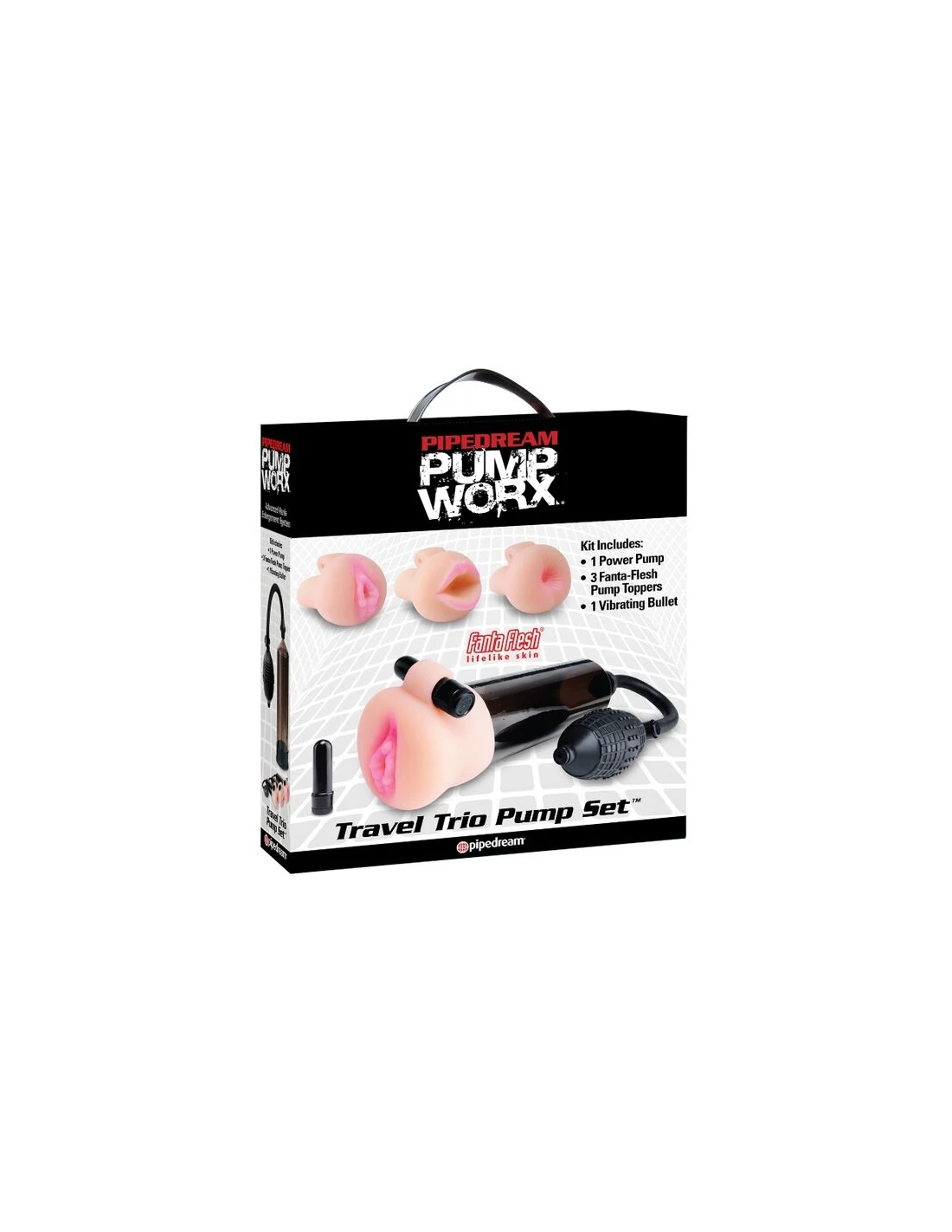 ppDisfruta de tu intimidad cuando estas de viaje con el confort de como si estuvieras en tu casa con este desarrollador de viaje ppEsta coleccion de viaje transforma un desarrollador en una combinacion entre masturbador y bomba de succion ppEste kit de lujo compuesto por 9 piezas viene en una comoda caja de facil transporte con una bomba succionadora para principiantes 3 cabezales Fanta Flesh que te haran sentir como si estuvieras teniendo sexo vaginal anal y oral una bala vibradora resistente al agua un anillo para el pene y muestras gratuitas de lubricante Moist Lubricant jabon limpiador Pump Worx Toy Cleaner y crema espesante ppLos cabezales de Fanta Flesh son muy faciles de acoplar y tienen la opcion de acoplarle la bala vibradora para ampliar tu placer pulli100 Libre de PhalatospEnvolveran cada cada milimetro de tu varita magica del placerbr Con cada apreton que le des a la bomba de estilo medica tu placer ira subiendo cada vez mas hasta alcanzar el cielo del placer ppUna vez que introduces tu pene por la apertura de PVC veras como se pone dura como una piedra rigida como un arbol y mas duradera que Matusalen y a su vez la sensacion te va gustando mas y mas y mas ppEl tubo de vacio transparente te permite ver crecer a tu grandullon y la valvula de liberacion rapida te permite aliviar la presion ppPara prolongar tu ereccion desliza el anillo a lo largo de tu miembro hasta que lo encuentres comodo pero ajustado ppUna vez hayas terminado y para mantenerlo como si fuera nuevo te recomendamos que simplemente separes el cilindro de la bomba de vacio y lo limpies con agua tibia y nuestro Pump Worx Toy Cleaner pulliMedidas 205 cm x 8 cm liliPilas Incluidas p