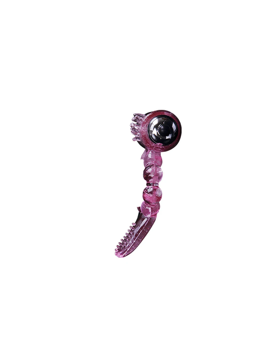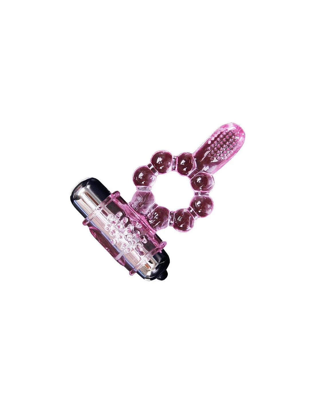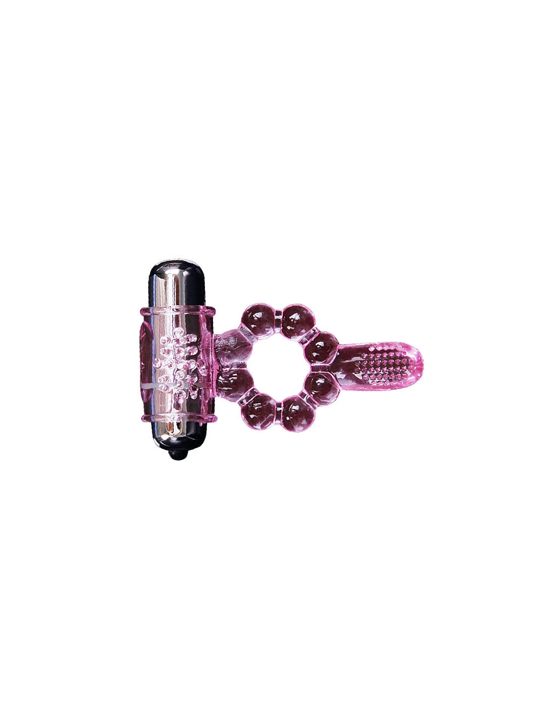 Anillo con doble vibración y doble estimulación. Por una parte estimulación del clítoris, con una textura en la zona. Y por otra parte una legua para la estimulación del punto anal.
