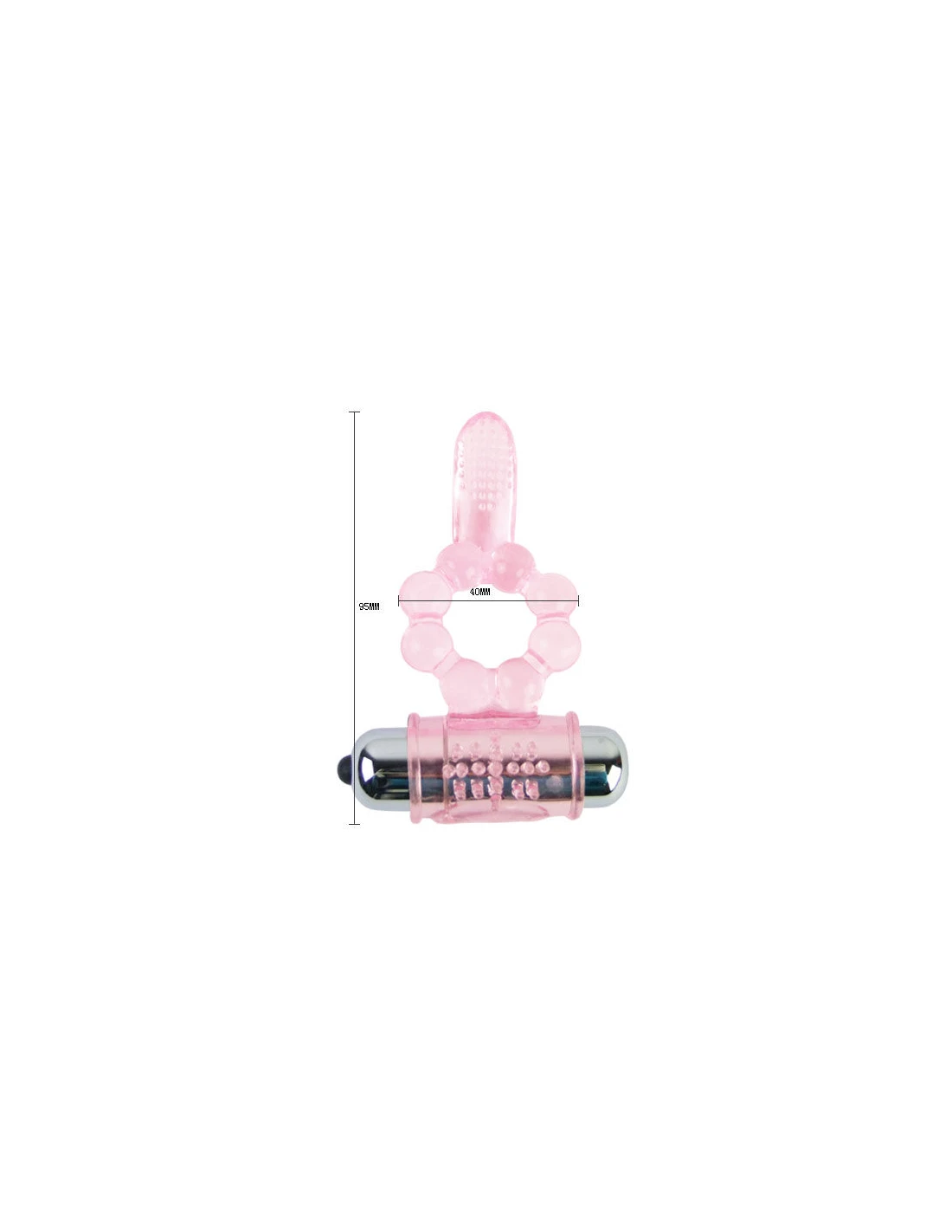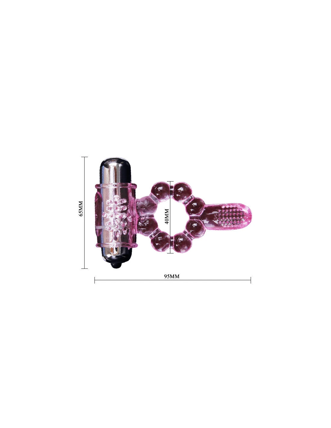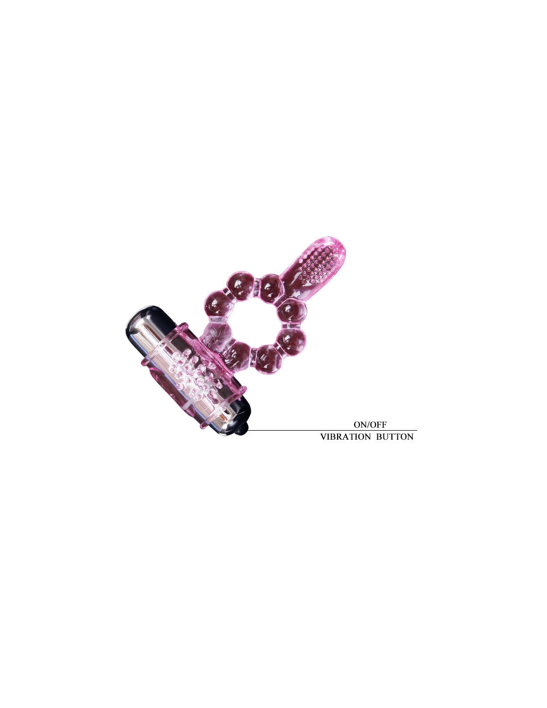 Anillo con doble vibración y doble estimulación. Por una parte estimulación del clítoris, con una textura en la zona. Y por otra parte una legua para la estimulación del punto anal.