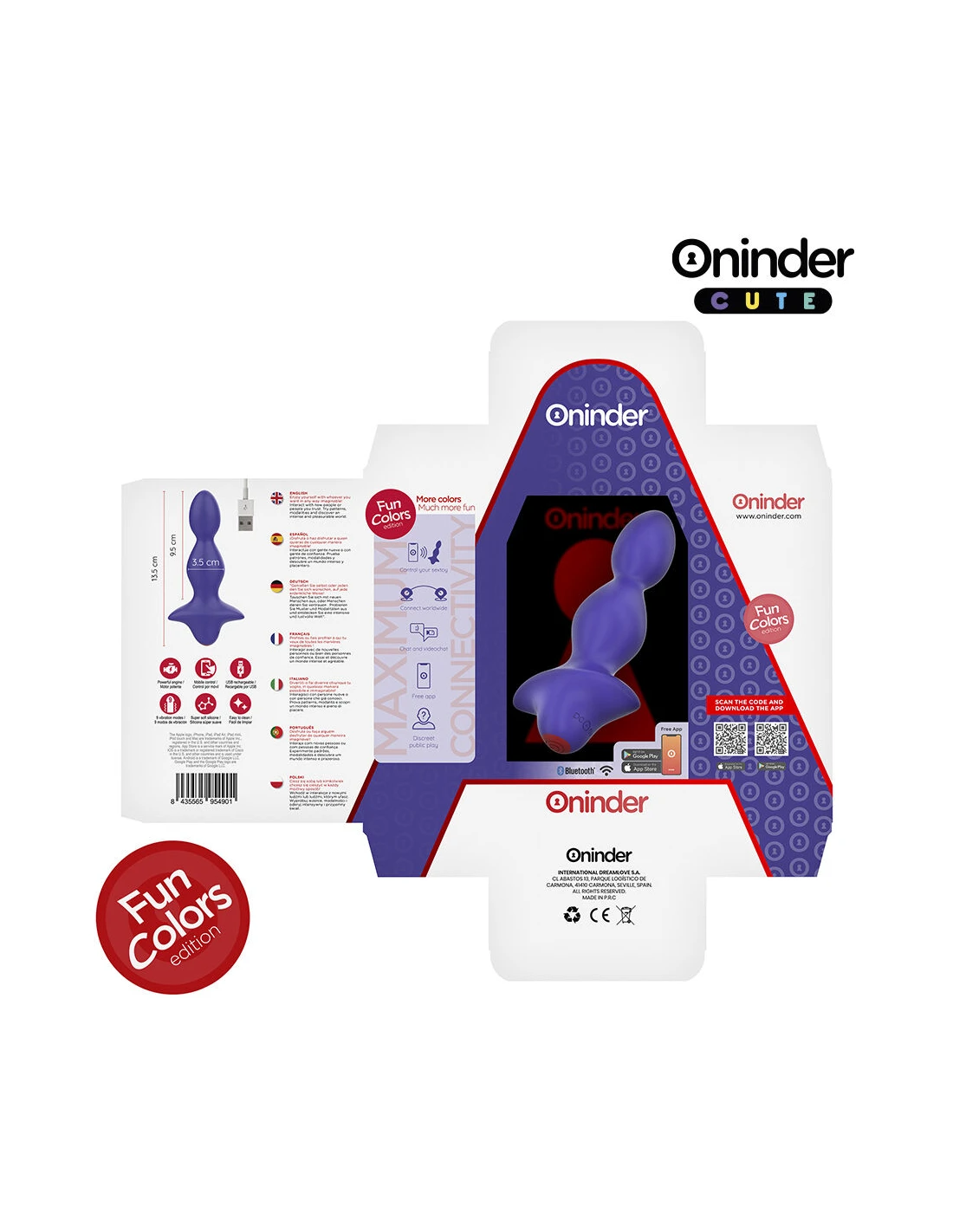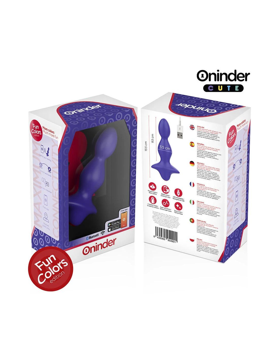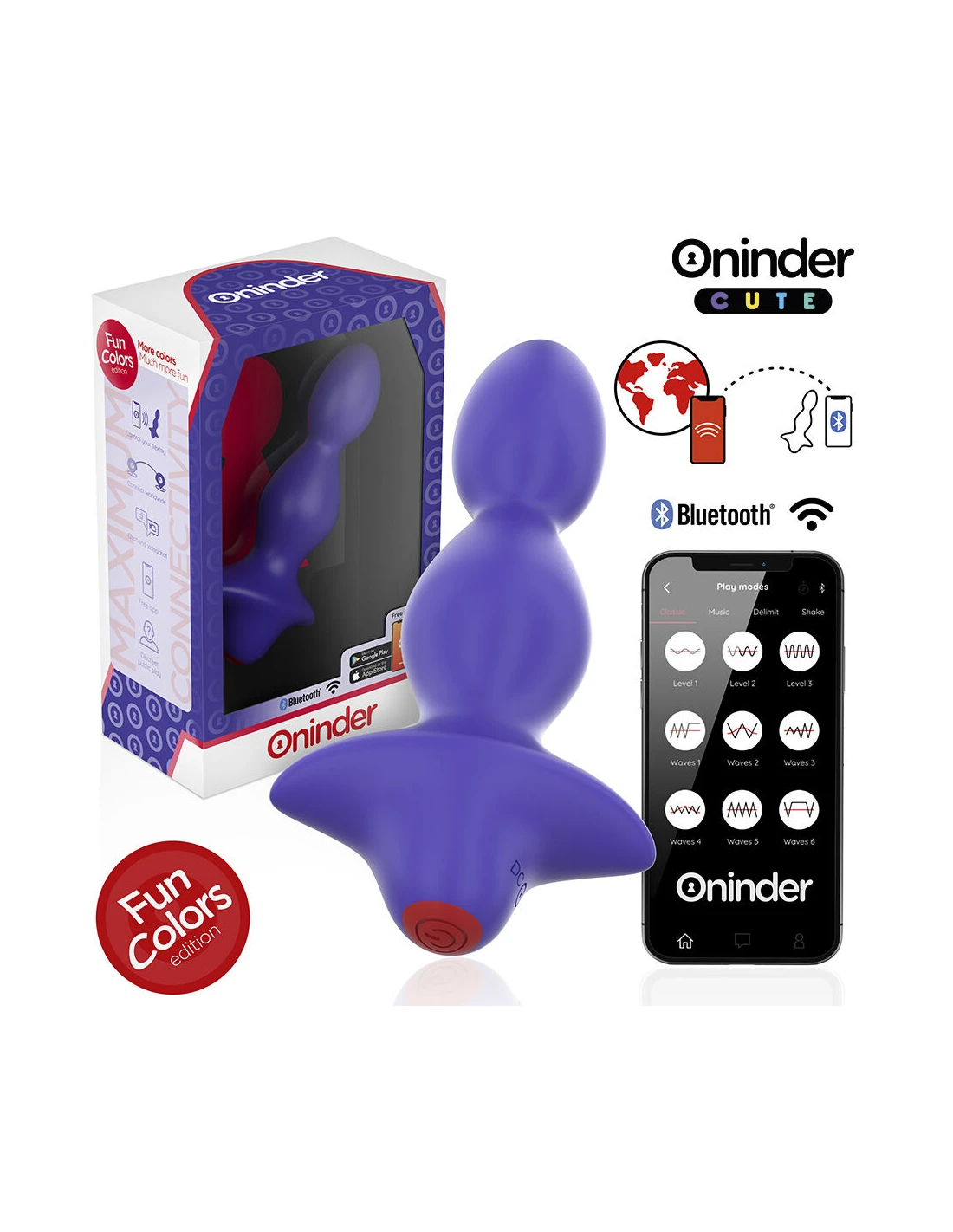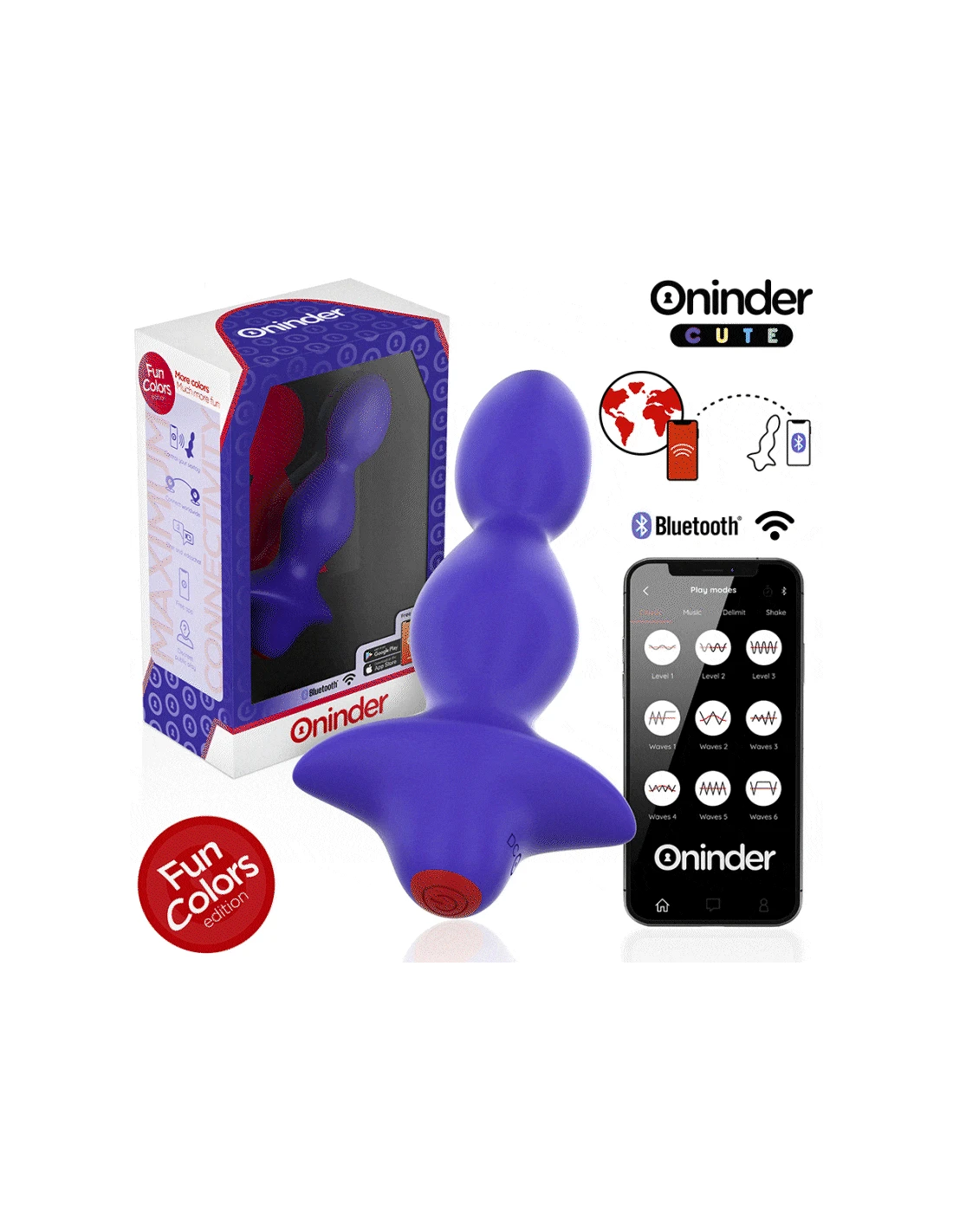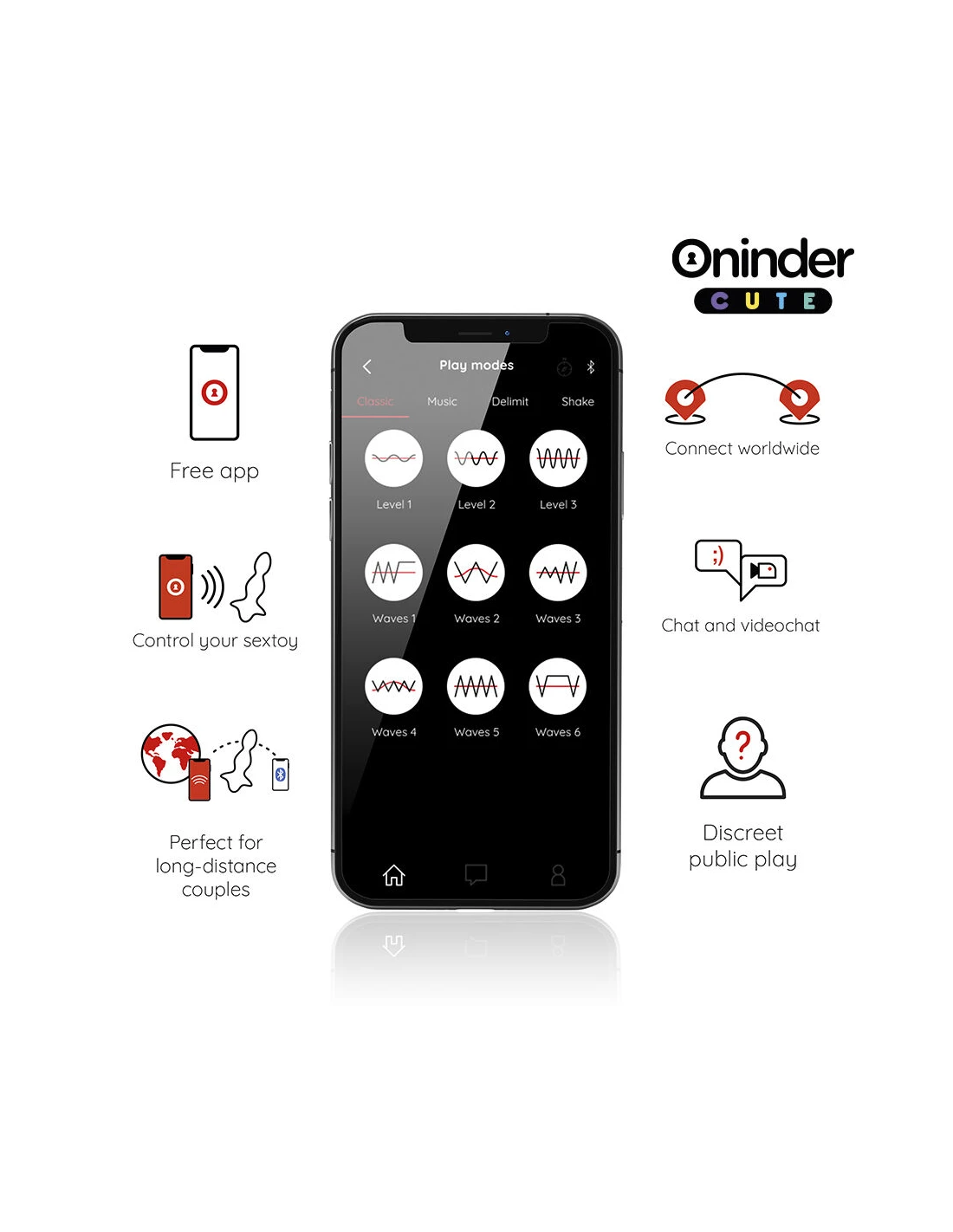 Con este vibrador no solamente puedes elegir entre combinaciones de intensidad y vibraciones preestablecidas, sino que también puedes compartir a un innovador control basado en una aplicación. Simplemente tienes que descargar la aplicación gratuita ONINDER™   en tu dispositivo Android o iOS y conectar tu smartphone o Tablet.