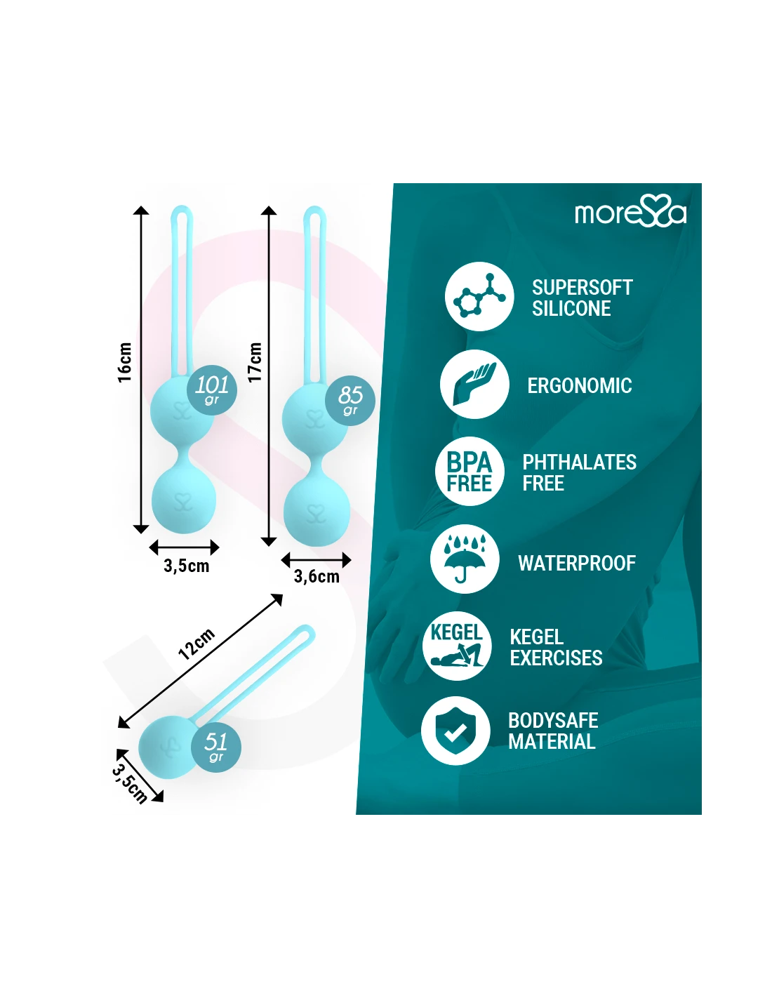 Las bolas Moressa son completamente lisas facilitando la inserción y produciendo sensación de confort. Fácil de utilizar y limpiar, es una elección perfecta para una salud impecable de los músculos pélvicos.