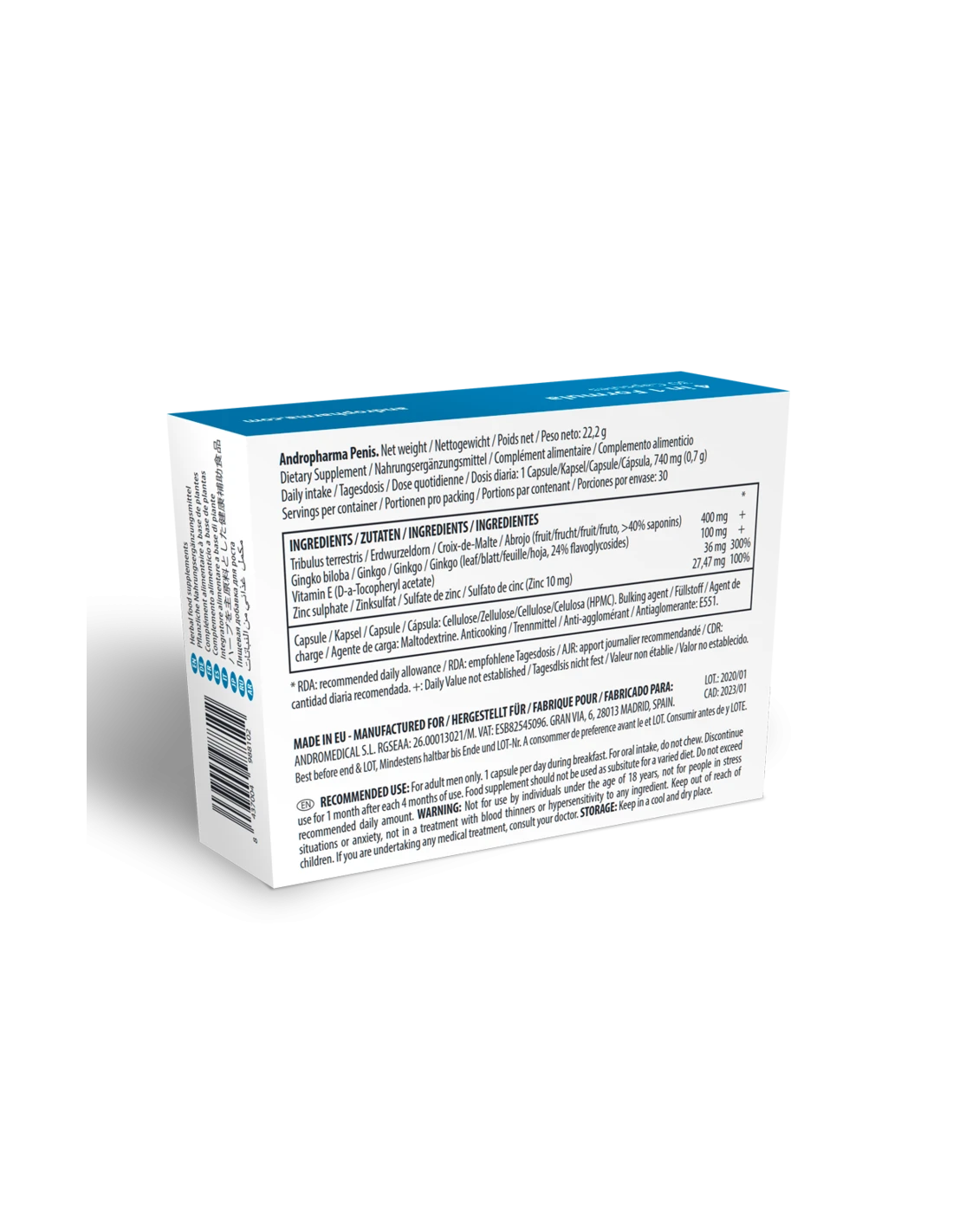 Andropharma Penis es un complemento alimenticio en cápsulas diseñado para apoyar la vitalidad masculina. Su fórmula exclusiva combina extractos de plantas, aminoácidos, vitaminas y minerales cuidadosamente seleccionados para favorecer la circulación sanguínea, el rendimiento físico y la función sexual.