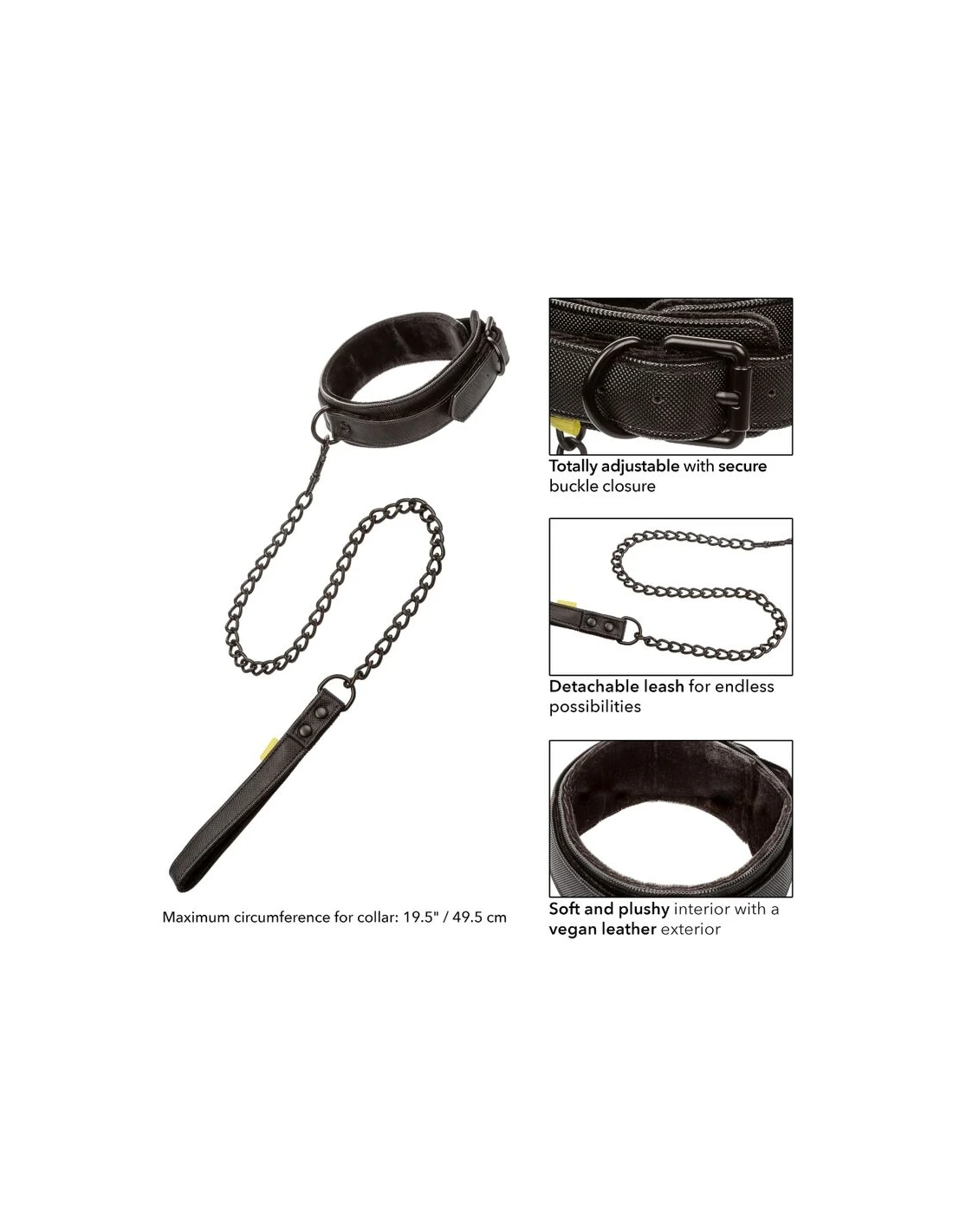 - Información adicional: Resistente collar con correa desmontable | Totalmente ajustable con cierre de hebilla seguro | Resistente cadena metálica | Cierres universales y anillos en D con diseño giratorio para una total destreza | Interior suave y lujoso con exterior de cuero vegano | Doble acolchado, doble costura | Diseño funcional, duradero y con textura