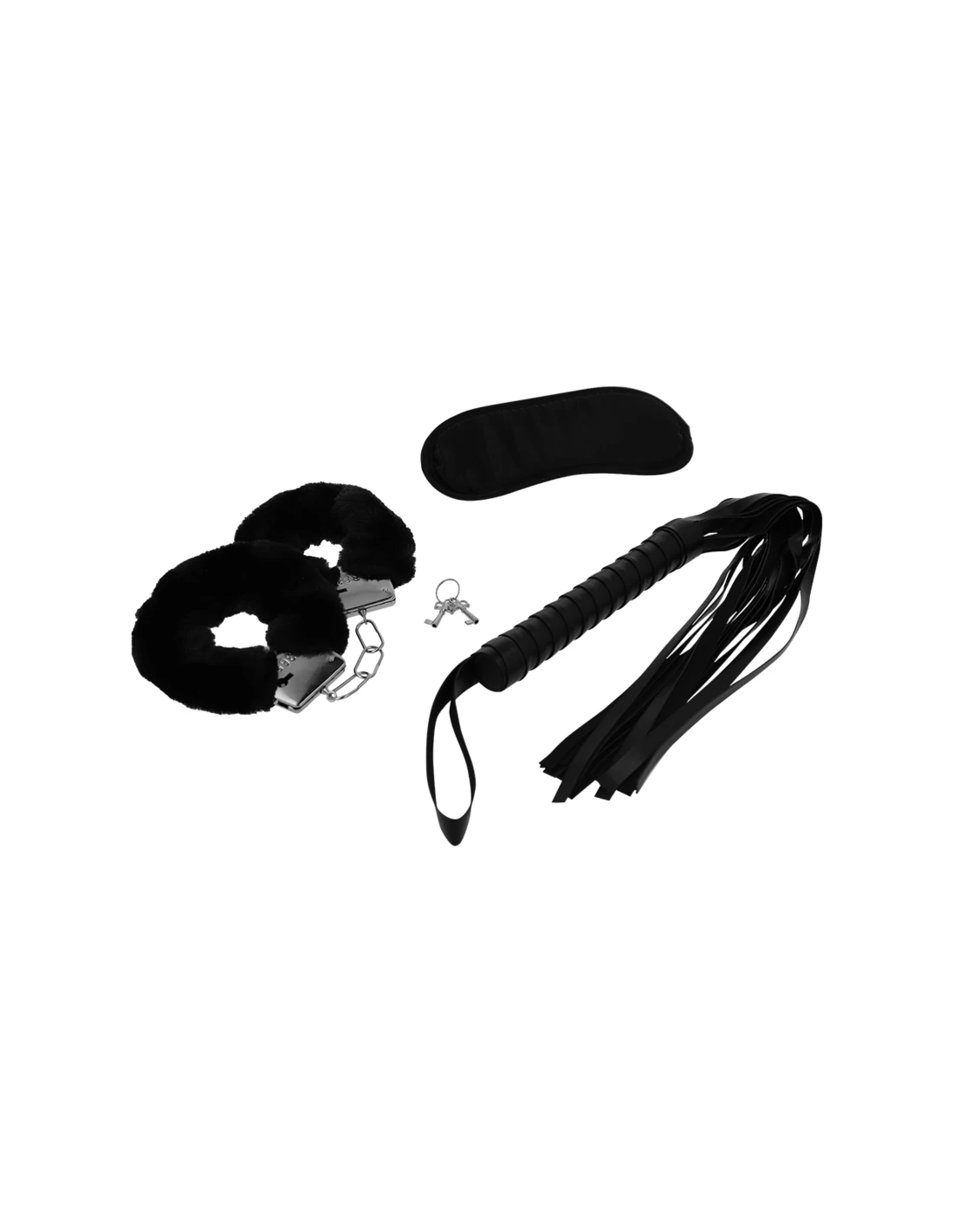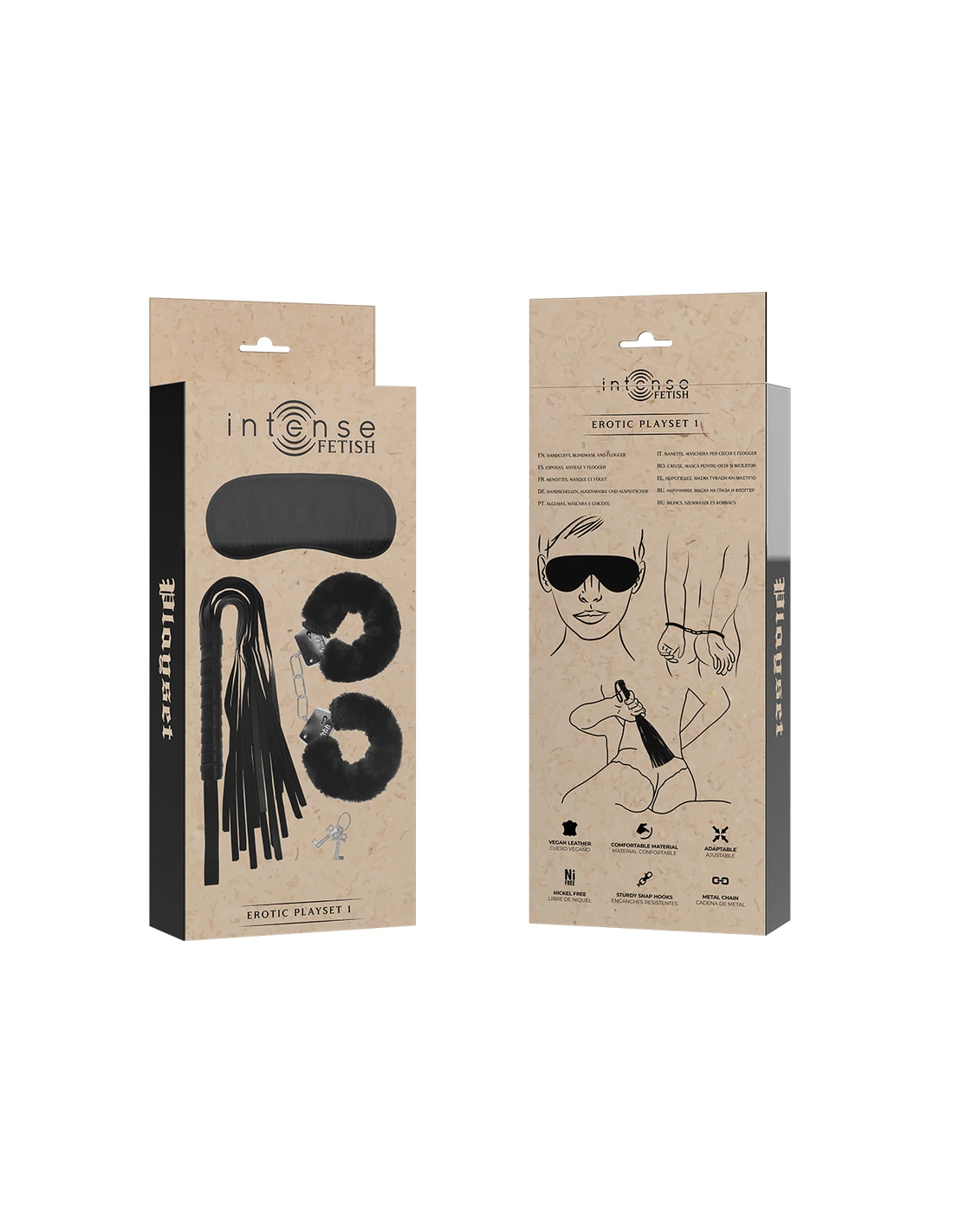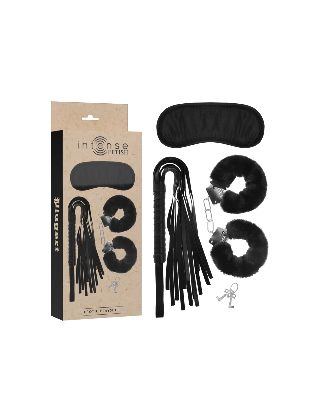 INTENSE - FETISH SET ERÓTICO 1 CON ESPOSAS, ANTIFAZ Y LÁTIGO DE CUERO VEGANO