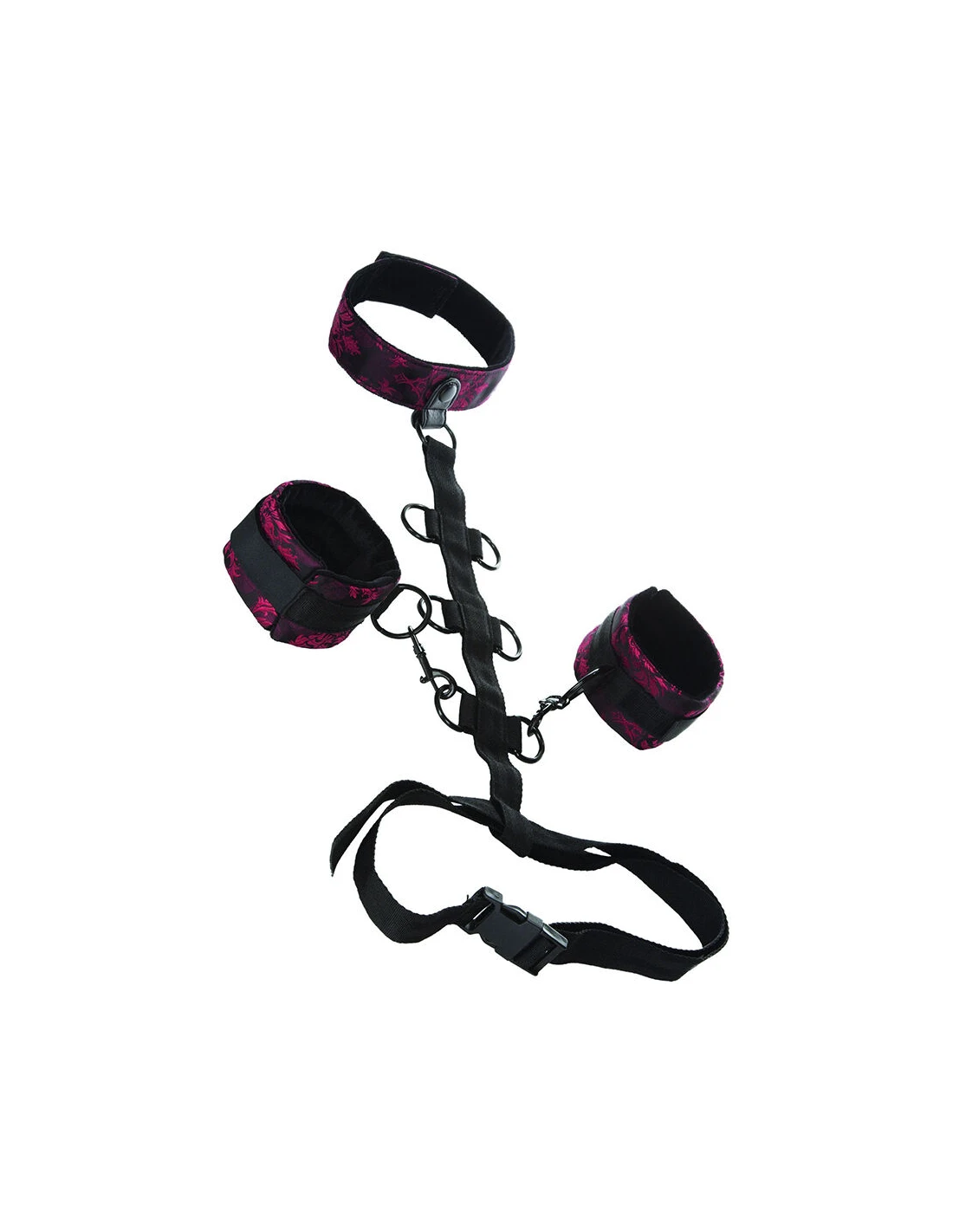 Sumérgete en la sensualidad de la esclavitud con el collar de atadura Scandal. Este impactante collar cuenta con un lujoso collar, esposas desmontables y múltiples opciones de sujeción: por delante o por detrás. Tres niveles de restricción permiten que tu dominante decida cuánta libertad disfrutarás.