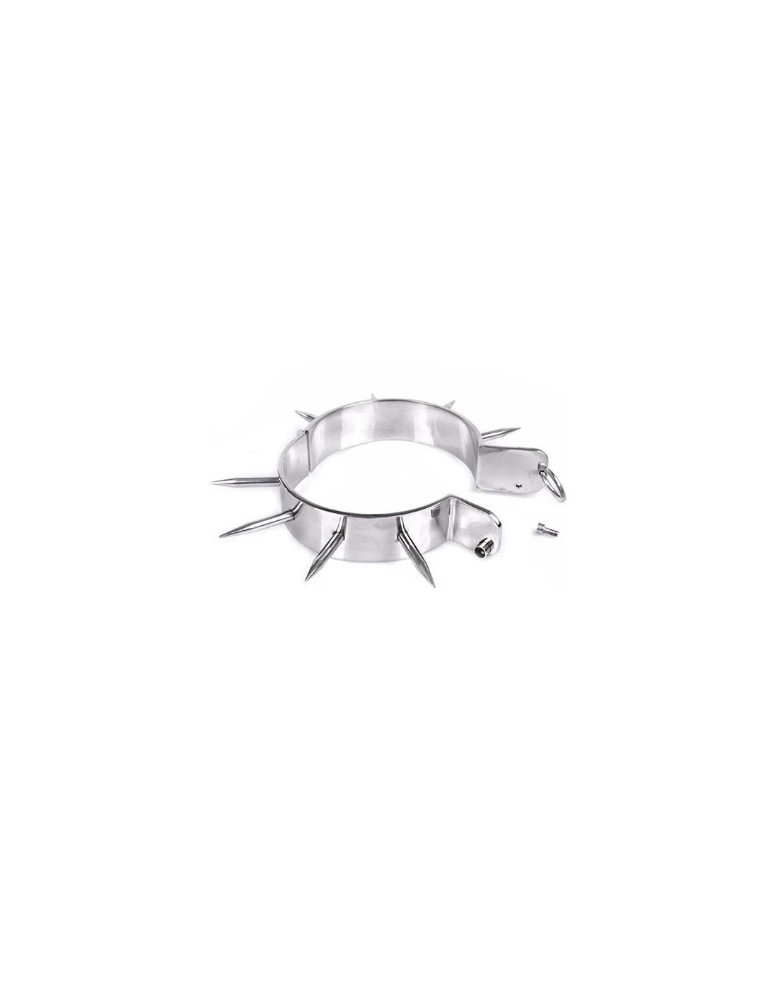 Este collar de metal cromado se cierra con una llave allen incluida. Tiene un acabado brillante con puntas punzantes. El collar tiene una anilla en O para enganchar una cadena con mosquetón, una cuerda o cualquier otro artículo de bondage.