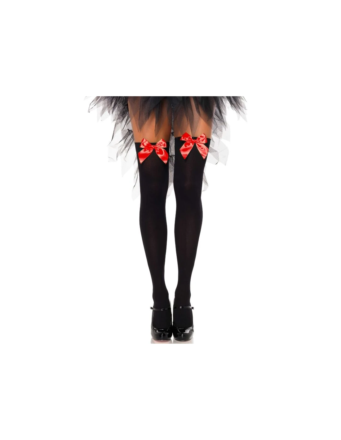 LEG AVENUE - MEDIAS ALTAS NEGRAS CON LACITO ROJO TALLA ÚNICA