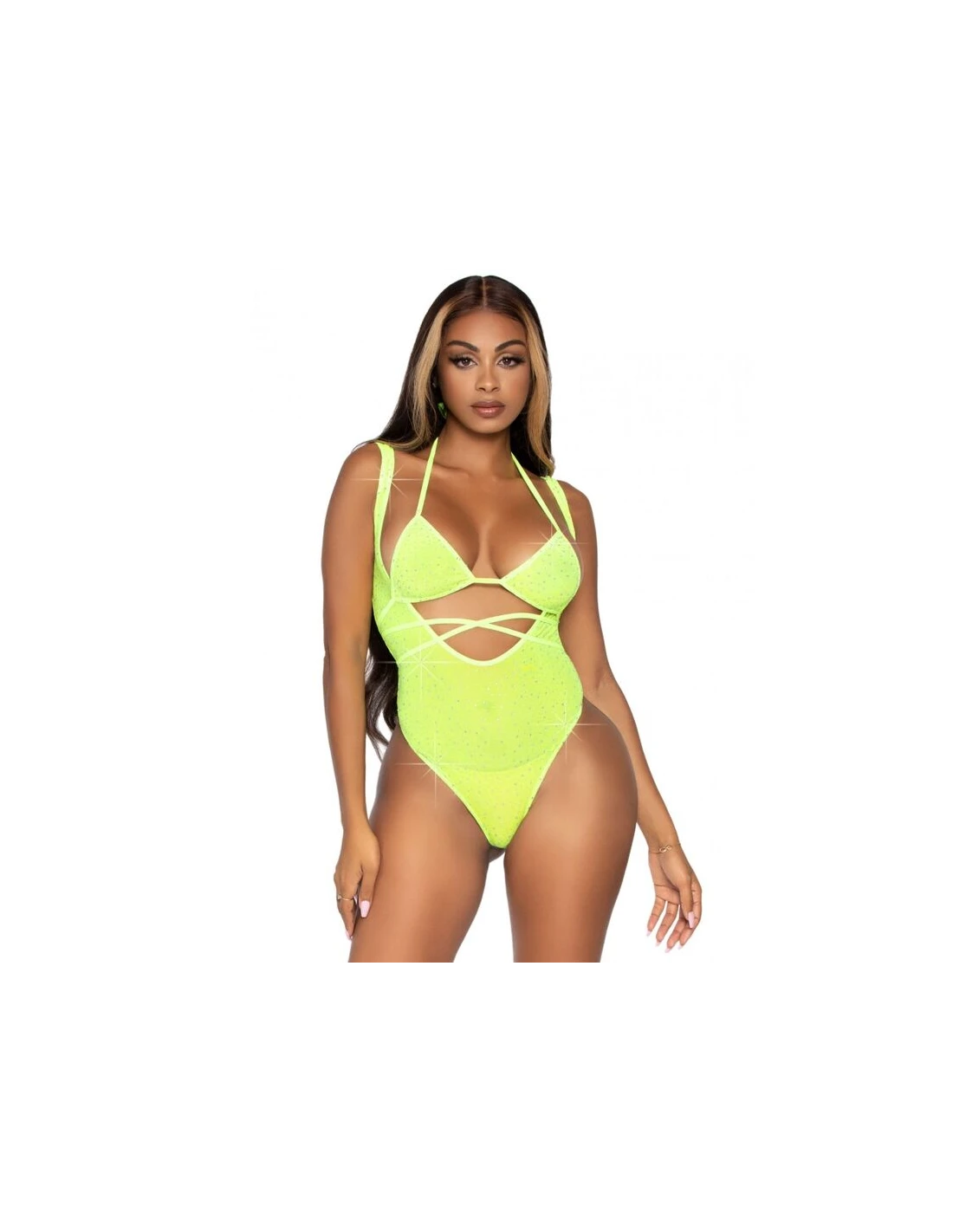 Conjunto de red y strass que incluye un top de bikini con tirantes envolventes y un body de tirantes. Con Leg Avenue reforzarás tu feminidad y obtendrás ese toque justo de seducción, sensualidad y elegancia.