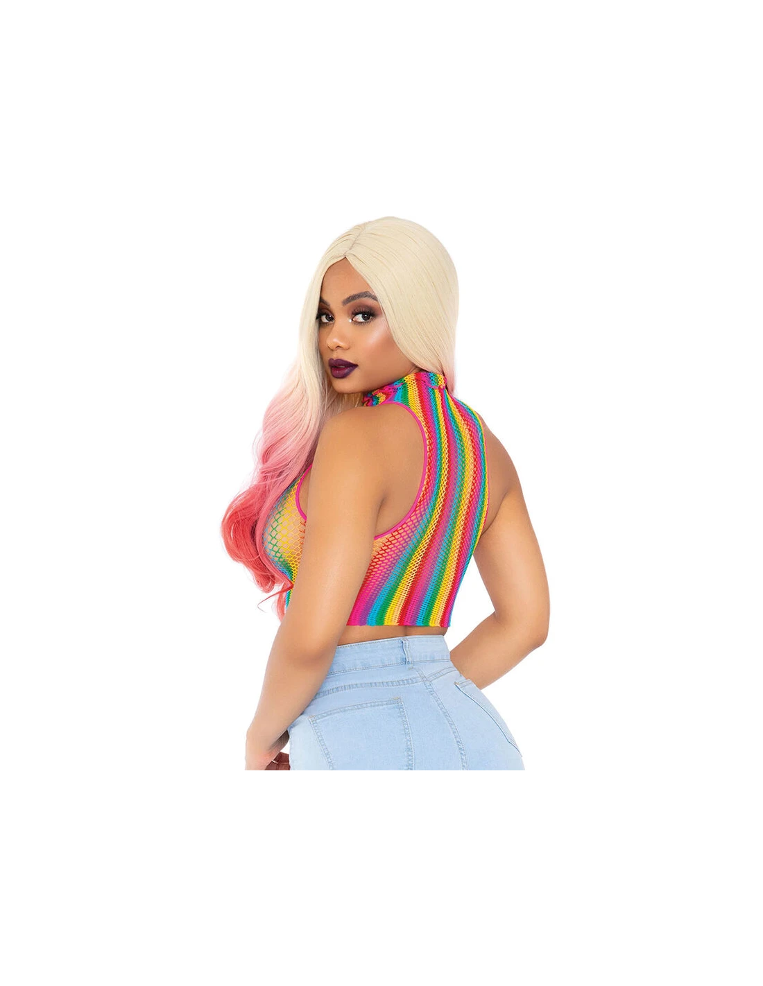 El top corto de cuello alto con red arcoíris es una prenda vibrante y llamativa, diseñada específicamente para destacar en festivales y eventos donde la expresión personal y la moda se fusionan en una celebración de color y estilo. Este top combina elementos de diseño moderno con una estética festiva, creando una pieza que es tanto funcional como visualmente impresionante.