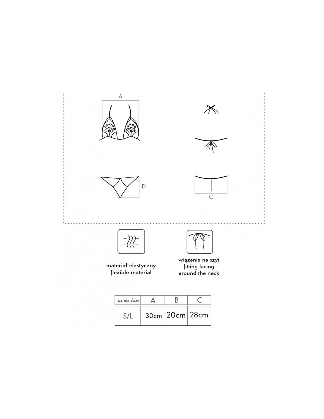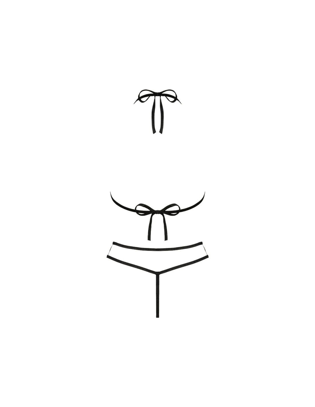 El inusual y picante conjunto de Jimena se compone de sujetador y tanga a juego. Las cintas negras acentúan además su carácter seductor.
