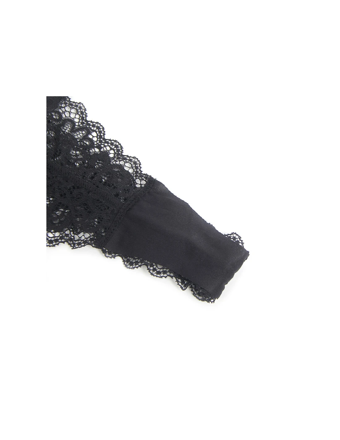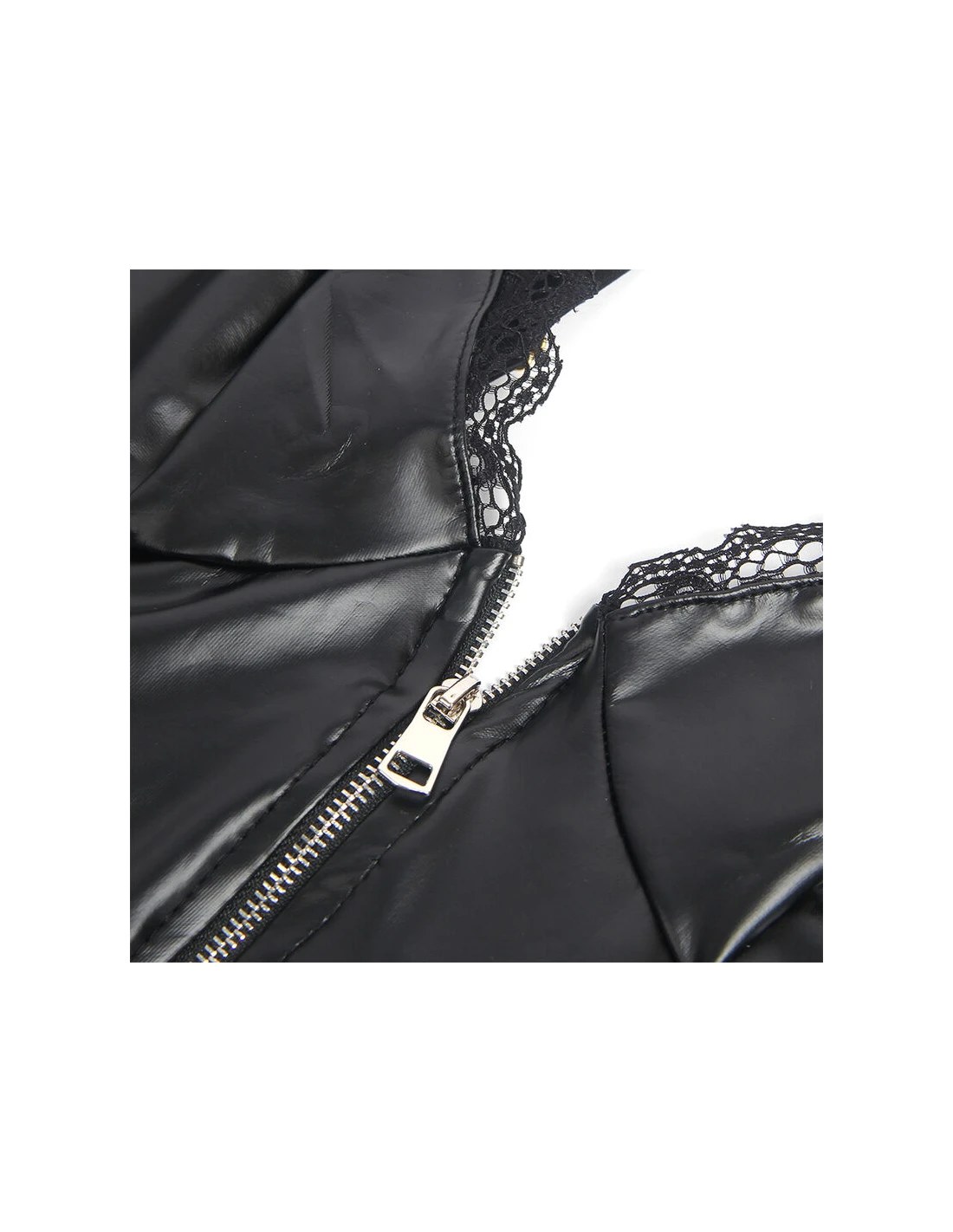 El color negro, elegante y versátil, junto con el contraste del encaje y el acabado en cuero PU, hace que este conjunto sea perfecto para resaltar tu lado más audaz y sofisticado.