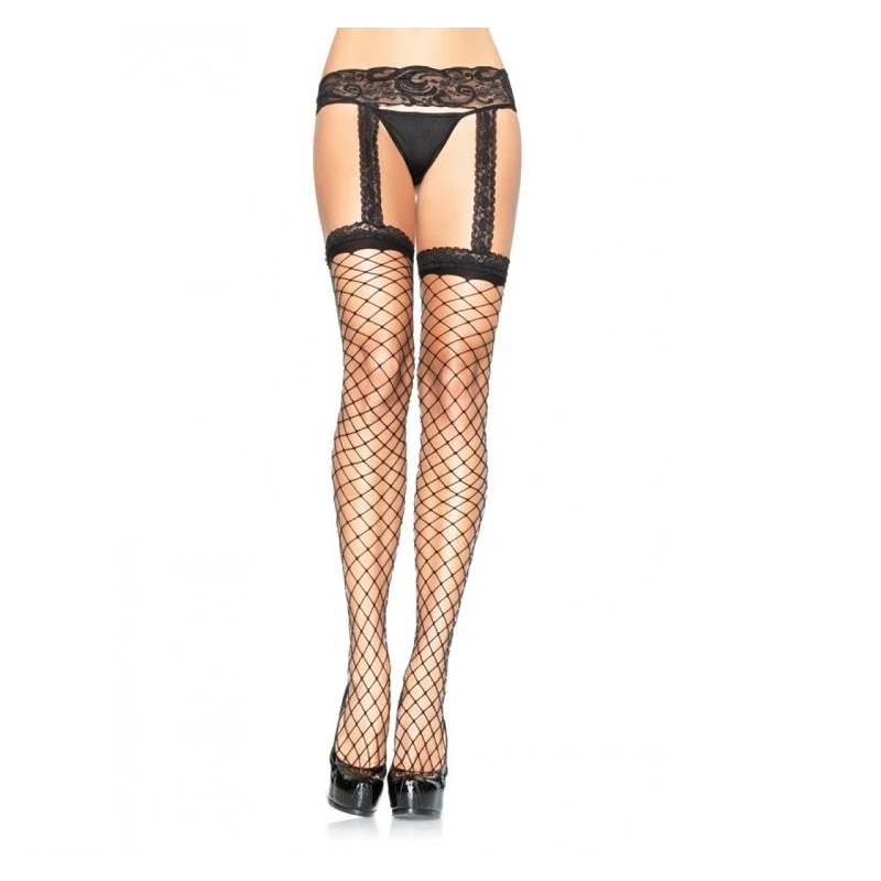 Medias de red con liguero en una sola pieza de encaje en color negro.