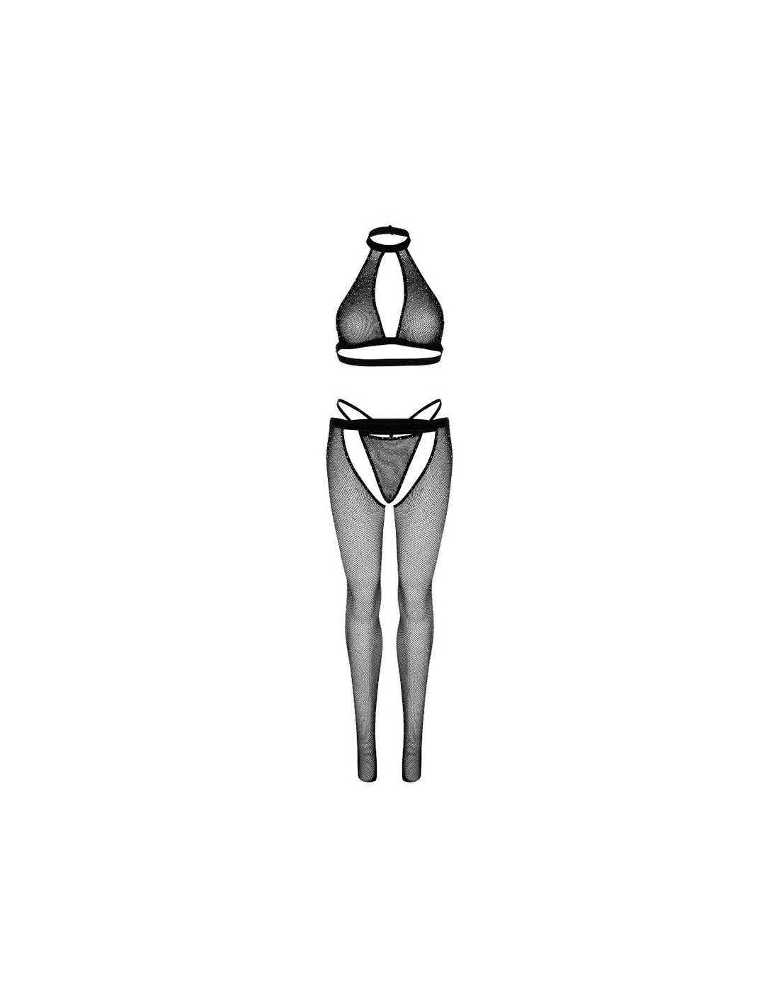 - Top halter de red con abertura en forma de ojo de cerradura, tanga y medias sin entrepierna.