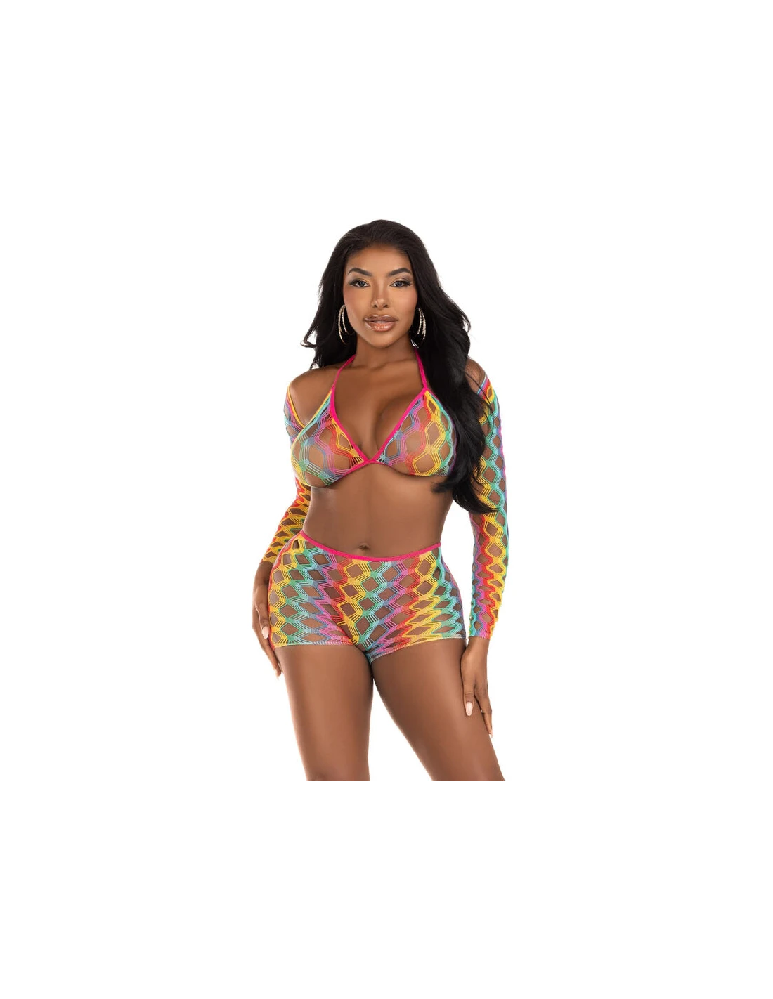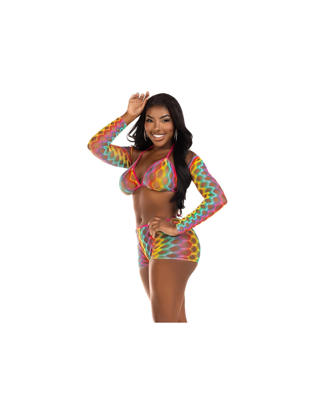 El conjunto de tres piezas de top con sujetador, bolero y pantalones cortos de malla en color arcoíris es una explosión de estilo y diversión. Diseñado para aquellas que desean destacar y expresar su personalidad vibrante, este conjunto es una declaración audaz de moda y originalidad.