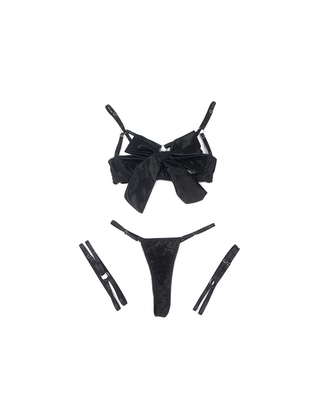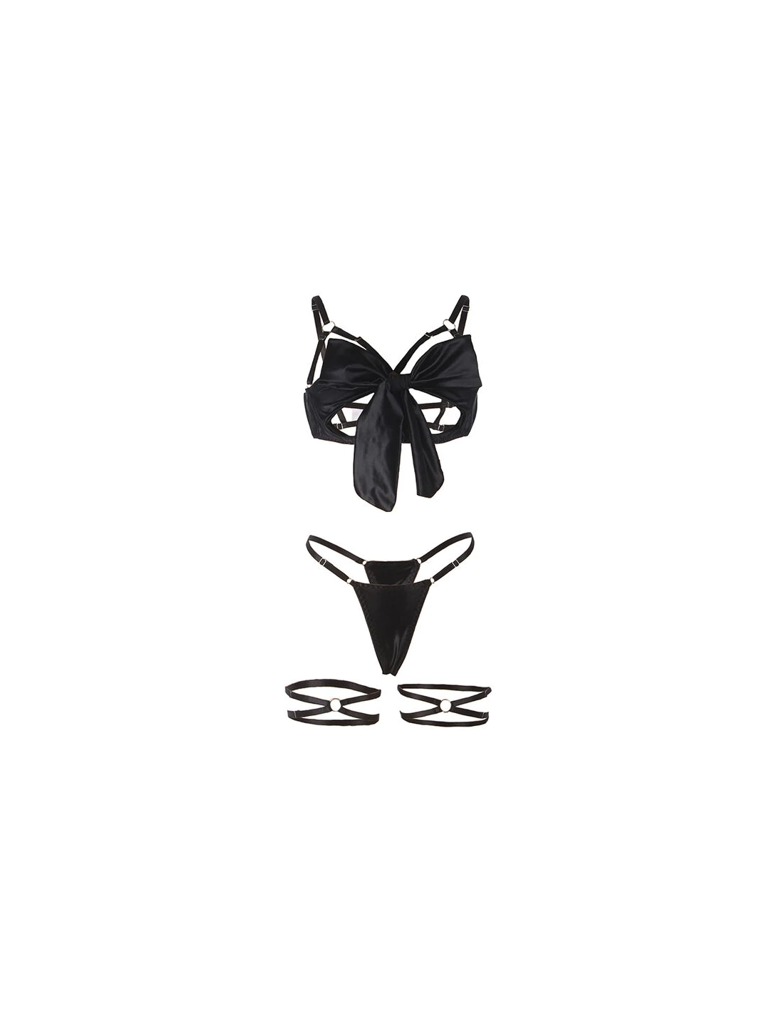 El sujetador cuenta con copas abiertas que realzan el busto de forma delicada, decorado con un coqueto lazo negro que añade un aire juguetón y seductor. Fabricado con un 95% de poliéster y un 5% de spandex/elastano, ofrece un ajuste cómodo y flexible que se adapta a la perfección a las curvas del cuerpo, garantizando comodidad y soporte.