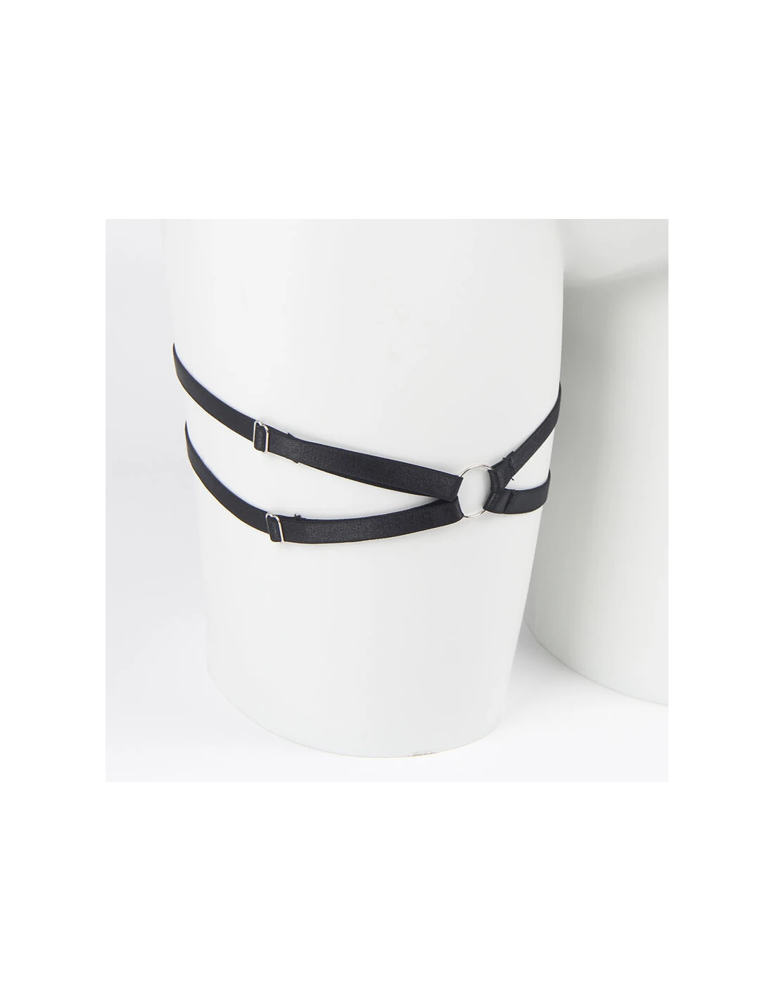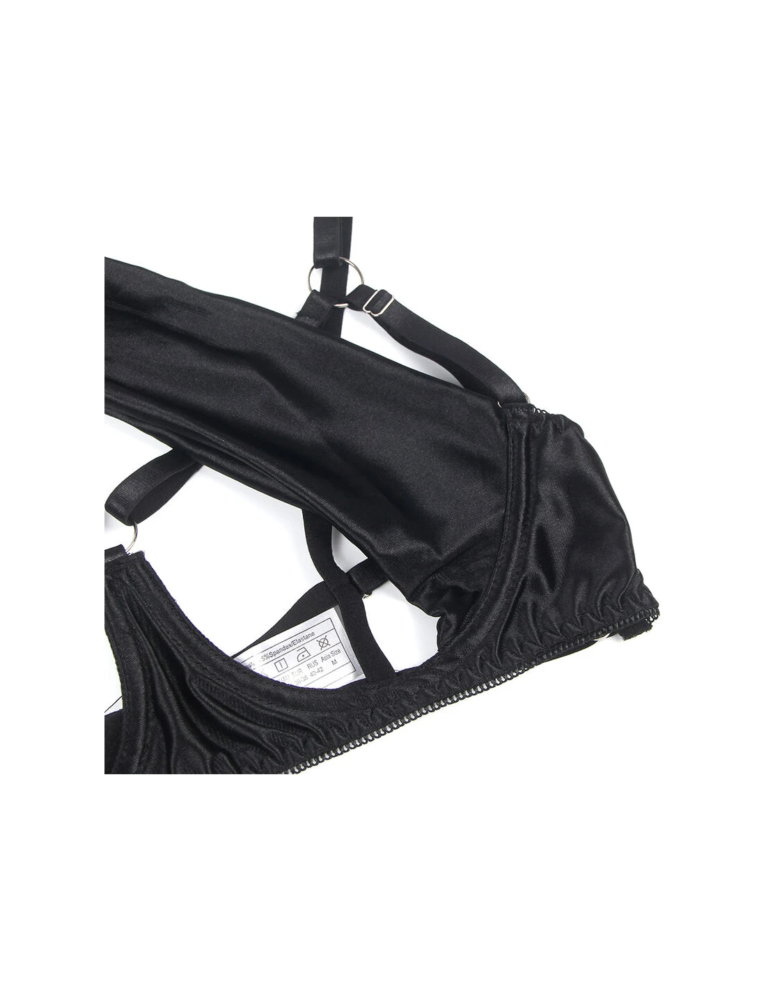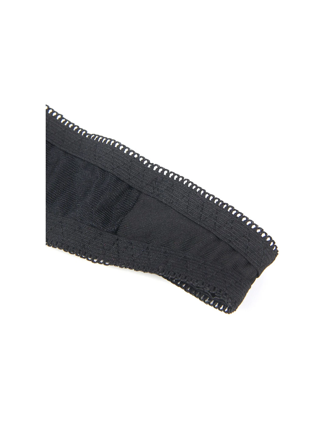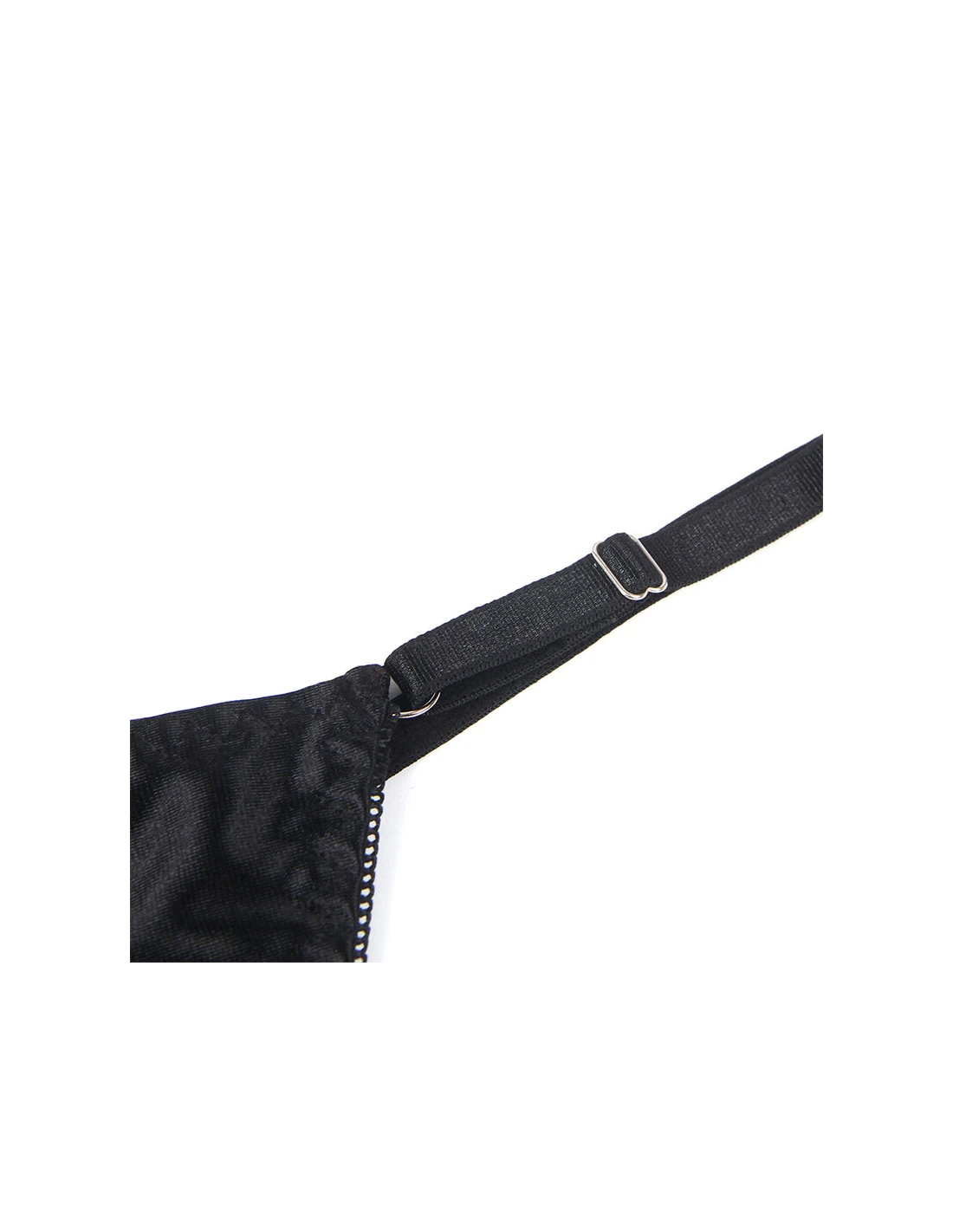 El tanga, minimalista y atrevido, complementa el diseño del sujetador, mientras que el liguero añade un toque irresistible de sofisticación. Este detalle adicional permite combinarlo con medias para completar un look audaz y provocador, ideal para momentos de intimidad o para sorprender con un estilo impecable.