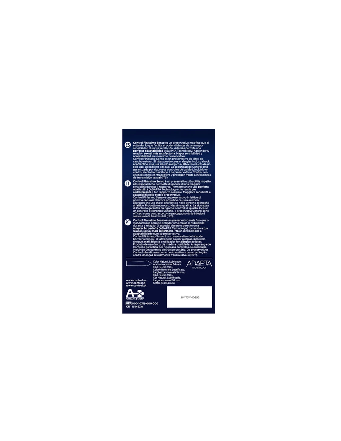Control Adapta Senso es un preservativo en látex de caucho natural de máxima calidad, fino, liso, anatómico, de lados no paralelos, transparente, lubricado y con depósito