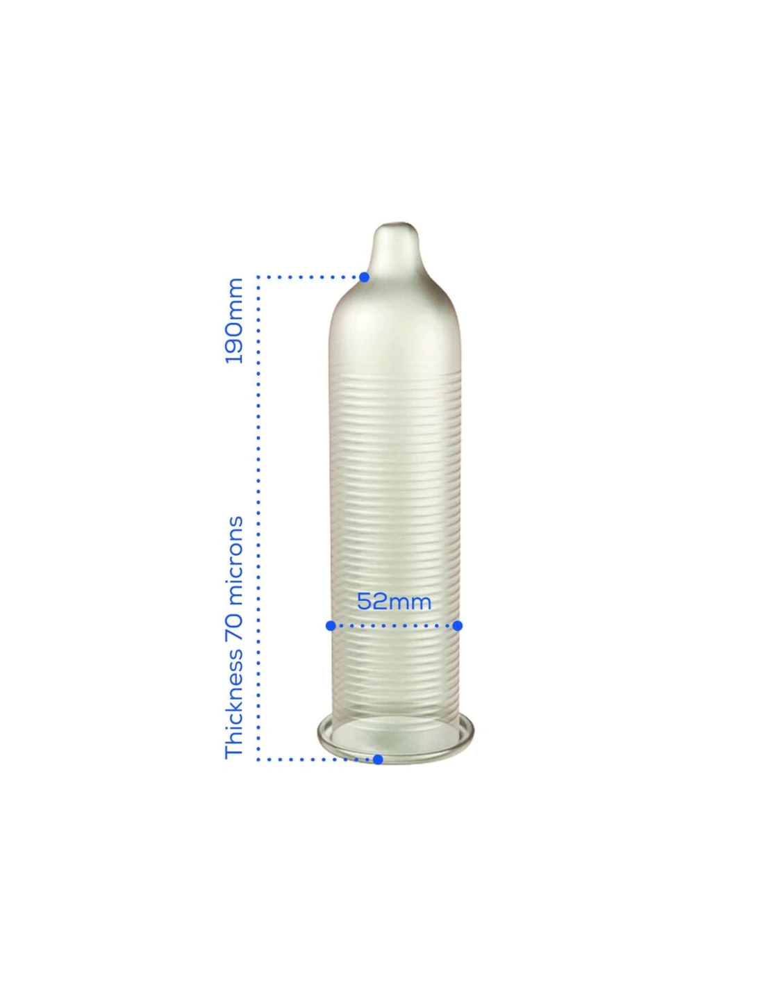El preservativo pasante calor con estrías es recomendado para las parejas que quieran disfrutar al máximo y en una forma excitantemente diferente durante sus relaciones sexuales. Son transparentes, estriados, rectos y con depósito