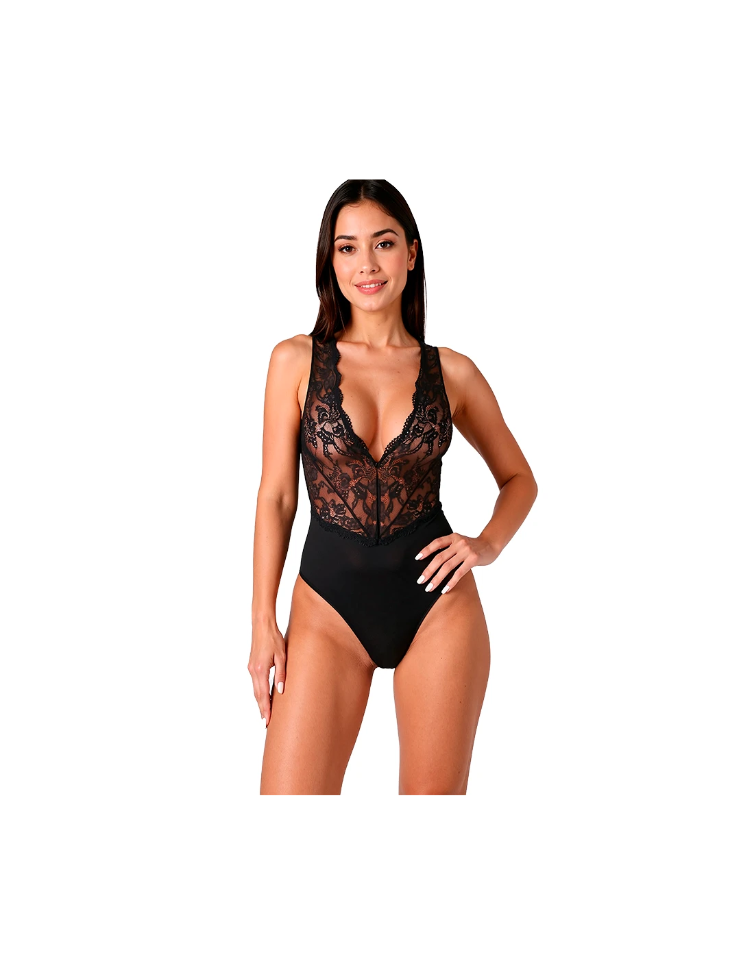- Estilo: Body con escote en V pronunciado en la parte delantera y espalda abierta con detalles de encaje