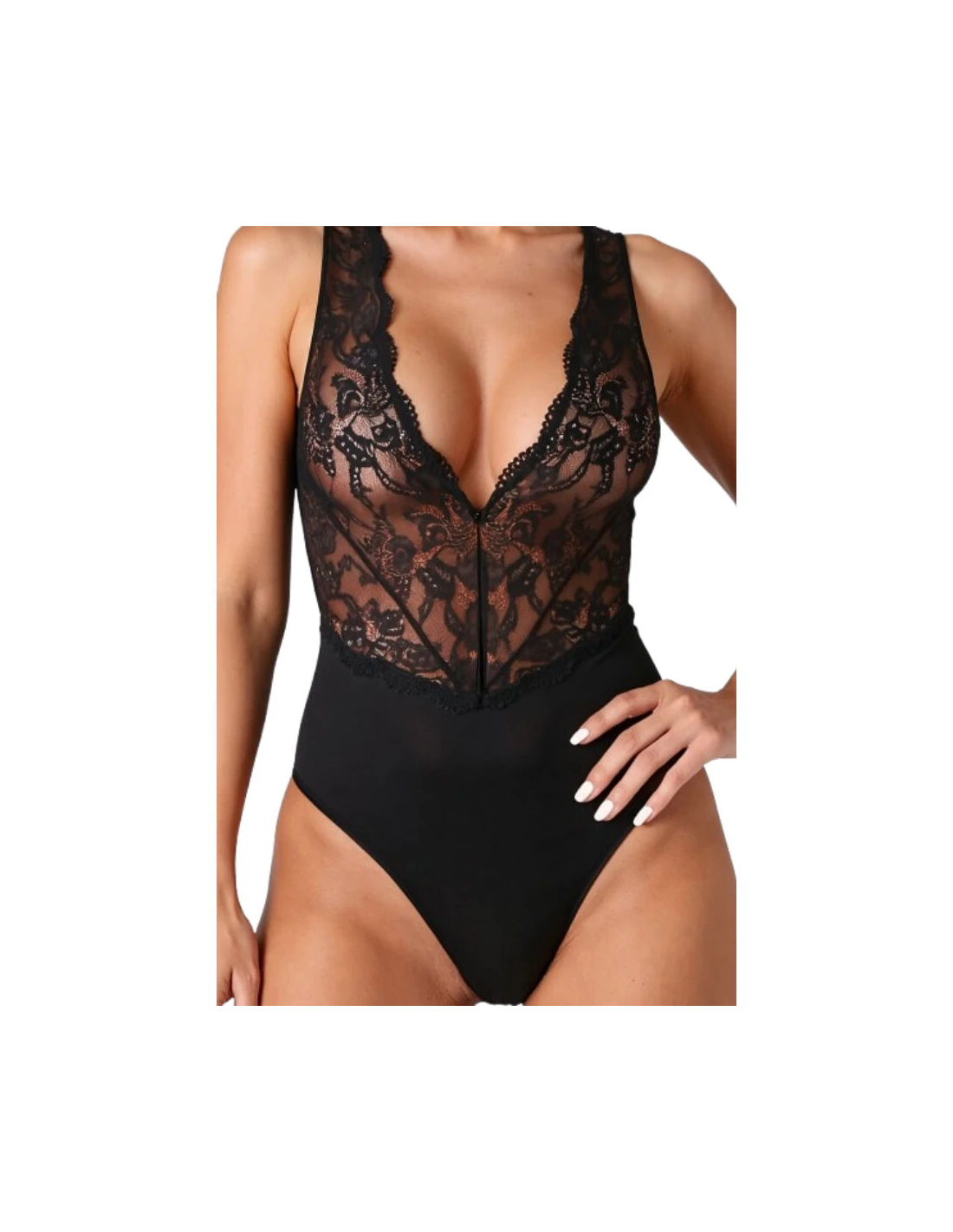 El Body EVALIE encarna la esencia de la elegancia y la sensualidad femenina. Confeccionado con una refinada combinación de delicado encaje y tejido suave y elástico, logra el equilibrio perfecto entre sofisticación y minimalismo moderno. El profundo escote en V, adornado con un intrincado encaje, realza el busto con belleza, aportando ligereza a la silueta. Las transparencias en la parte delantera aportan un toque atrevido, mientras que la suave parte inferior garantiza un ajuste y una comodidad impecables.