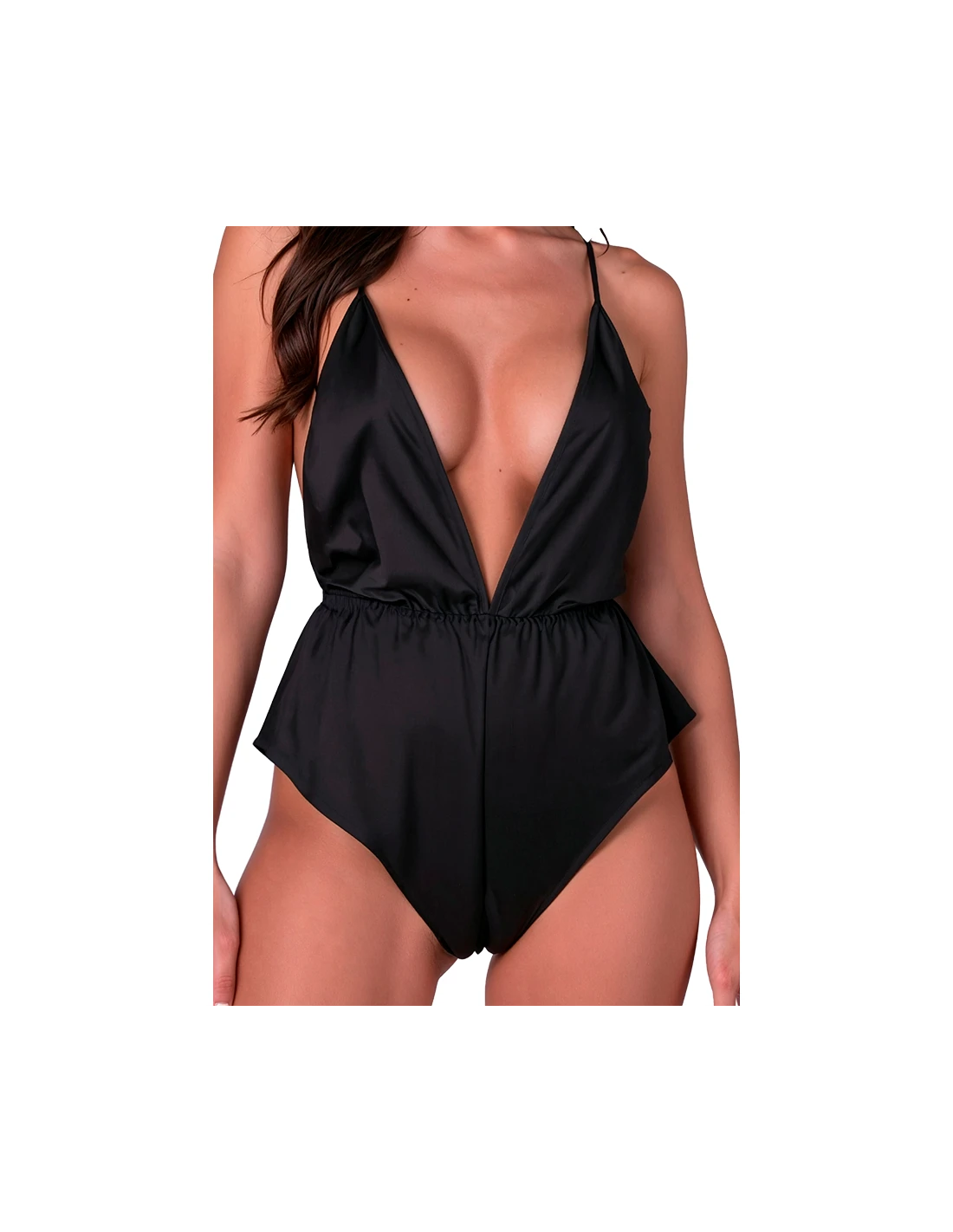 - Estilo: Body satinado con escote en V pronunciado y tirantes cruzados ajustables en la espalda